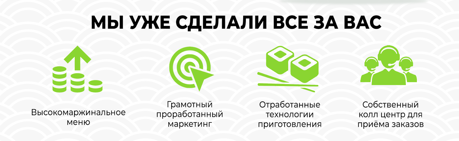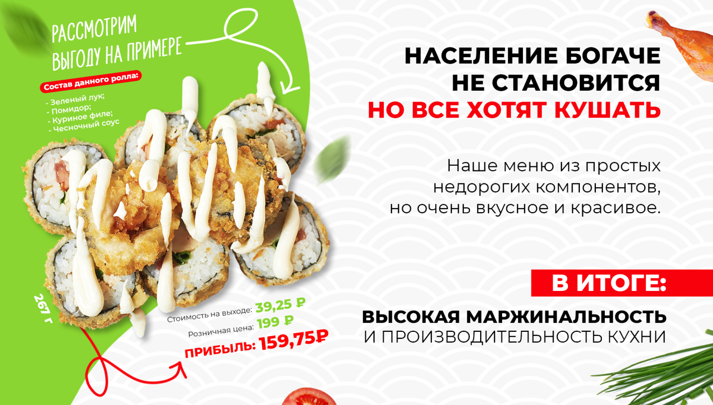 С маркетологами мы продумали акции, которые смогут зацепить наших потенциальных клиентов, прорабатывали прочие маркетинговые материалы и даже адаптировали меню уже по ходу работы. Очень кропотливый процесс, который заводит многих начинающих предпринимателей в тупик. Благо, этот этап мы прошли, зафиксировали и теперь делимся его результатами с нашими партнерами. Рекламу мы запускали практически везде, где можно. Это и Яндекс Директ, и Google Adwords, и социальные сети. Было принято решение оказывать воздействие на аудиторию в первую очередь акционными предложениями. Мало кто будет платить полный ценник заведению, которое только открылась. Важно привлечь к себе внимание. Мы были уверены в том, что наши роллы — это вкусно и качественно. И мы точно знали, что в плане качества можем обойти наших конкурентов. Но нужно было это показать. Именно поэтому на старте работы так важны скидки и акции. Чтобы как можно больше людей смогли распробовать наши блюда. На наш взгляд это самая эффективная стратегия в нише. Со стратегией не прогадали, она обеспечила поток заказов уже в день открытия. А дотошный контроль качества как продуктов, так и готовых блюд гарантировал лояльность тех, кто сделал хоть один заказ. Это все, конечно, очень интересно, но вы ведь сюда за конкретикой пришли, да? Поэтому мы сейчас покажем несколько примеров наших промо-материалов. И даже не будем ругаться, если что-то будет скопировано и адаптировано. Ключевое слово — адаптировано. Наше конкурентное преимущество в первую очередь заключается в высокомаржинальном меню. Недорогие, но очень вкусные ролы всегда будут пользоваться популярностью. Также для снижения расходов важно максимально оптимизировать рабочее пространство на кухне и логистику. Впрочем, об этом мы уже как-то говорили. И вот такая оптимизация позволяет нам делать следующие предложения: Целый килограмм роллов всего за 715 рублей. Очень вкусных роллов из свежих и качественных продуктов. Разумеется, это не единственный пример. Посмотрите еще. Делать такие предложения невозможно, если система не работает как часы. Стоп-фактором для многих предпринимателей является сложность запуска заведений. Многим нужна помощь, от подбора помещения до выбора оборудования и набора персонала. Мы готовы оказать эту помощь. Более того, реализацию маркетинговой составляющей мы тоже берем на себя. Потому что мы умеем это делать, рука у нас набита. Наши партнеры в свою очередь должны иметь желание работать и следовать советам. Знания и опыт в сочетании с энтузиазмом — вот к какой синергии мы стремимся, строя партнерскую сеть Rolik. Переходите на сайт, чтобы узнать подробнее о нашей партнерской сети: franchise.roliksushi.ru