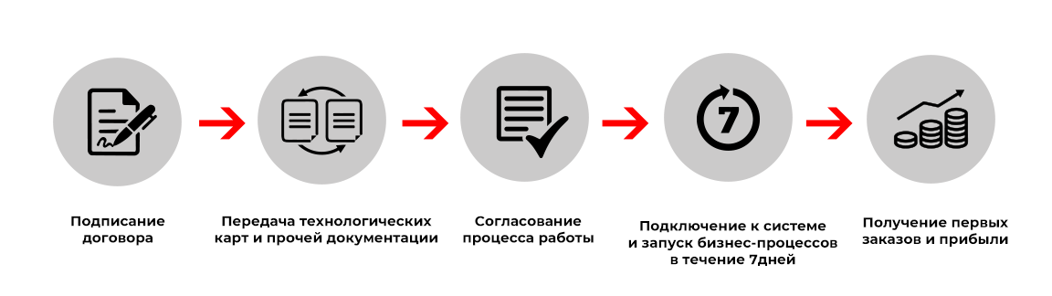 В среднем запуск занимает от семи до десяти рабочих дней. Начинаем мы только после подтверждения полной готовности: кухня соответствует стандартам, продукты находятся на складе, а повара уже все умеют.