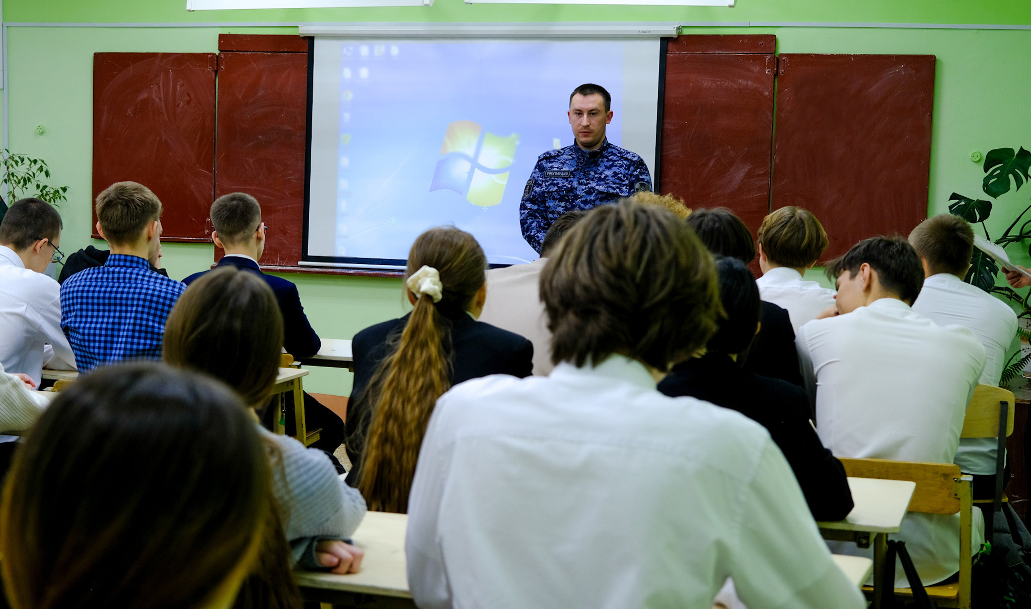 Представитель ведомства подробно рассказал школьникам о целях и задачах Федеральной службы войск национальной гвардии Российской Федерации, её структуре, истории, традициях, а также о подразделениях, входящих в состав территориального управления. Отдельное внимание офицер уделил представляемому им подразделению — вневедомственной охране. Ребята узнали о задачах этой службы, предоставляемых социальных гарантиях сотрудникам и перспективах карьерного роста.