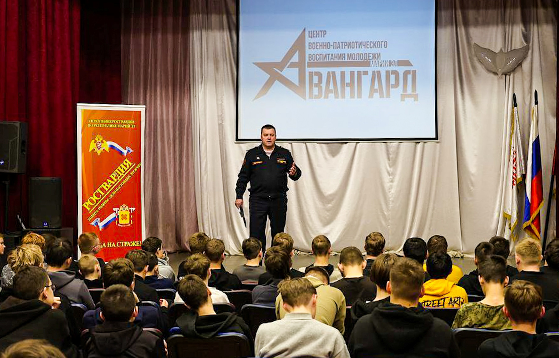 В рамках акции «На службу в Росгвардию» и учебных сборов в Центре военно-патриотического воспитания молодёжи «Авангард» для школьников состоялась особая встреча. К восьмиклассникам приехал командир батальона полиции отдела вневедомственной охраны Росгвардии по г. Йошкар-Оле подполковник полиции Сергей Сороканов.