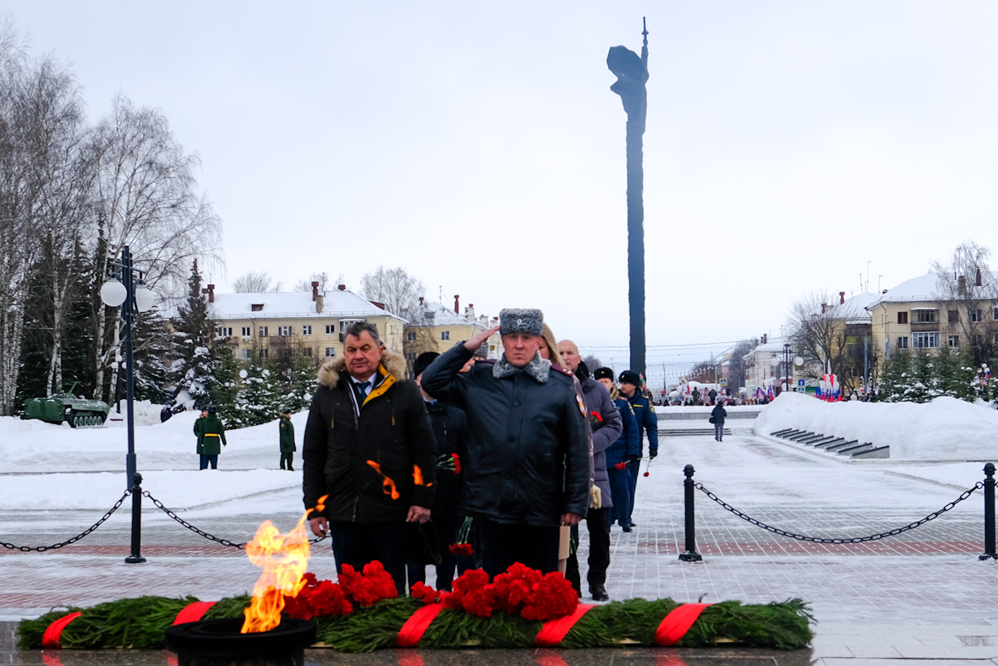 В День защитника Отечества врио начальника Управления Росгвардии по Республике Марий Эл полковник полиции Николай Курицын принял участие в митинге и возложении цветов к Монументу Воинской Славы и Вечному огню.
