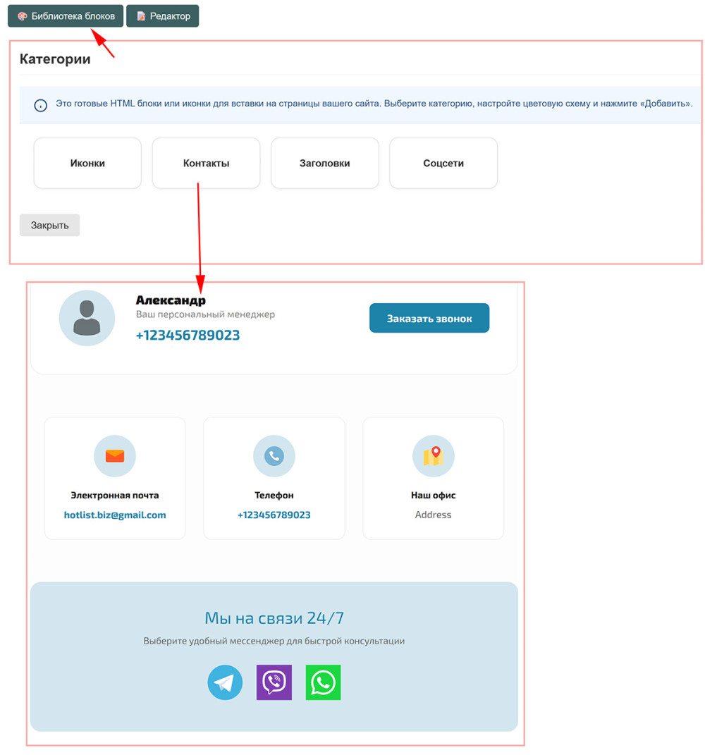 - Библиотека готовых HTML-блоков: вставляйте сложные элементы верстки (лендинг-секции, текстовые блоки, элементы дизайна) одним кликом без знания кода.