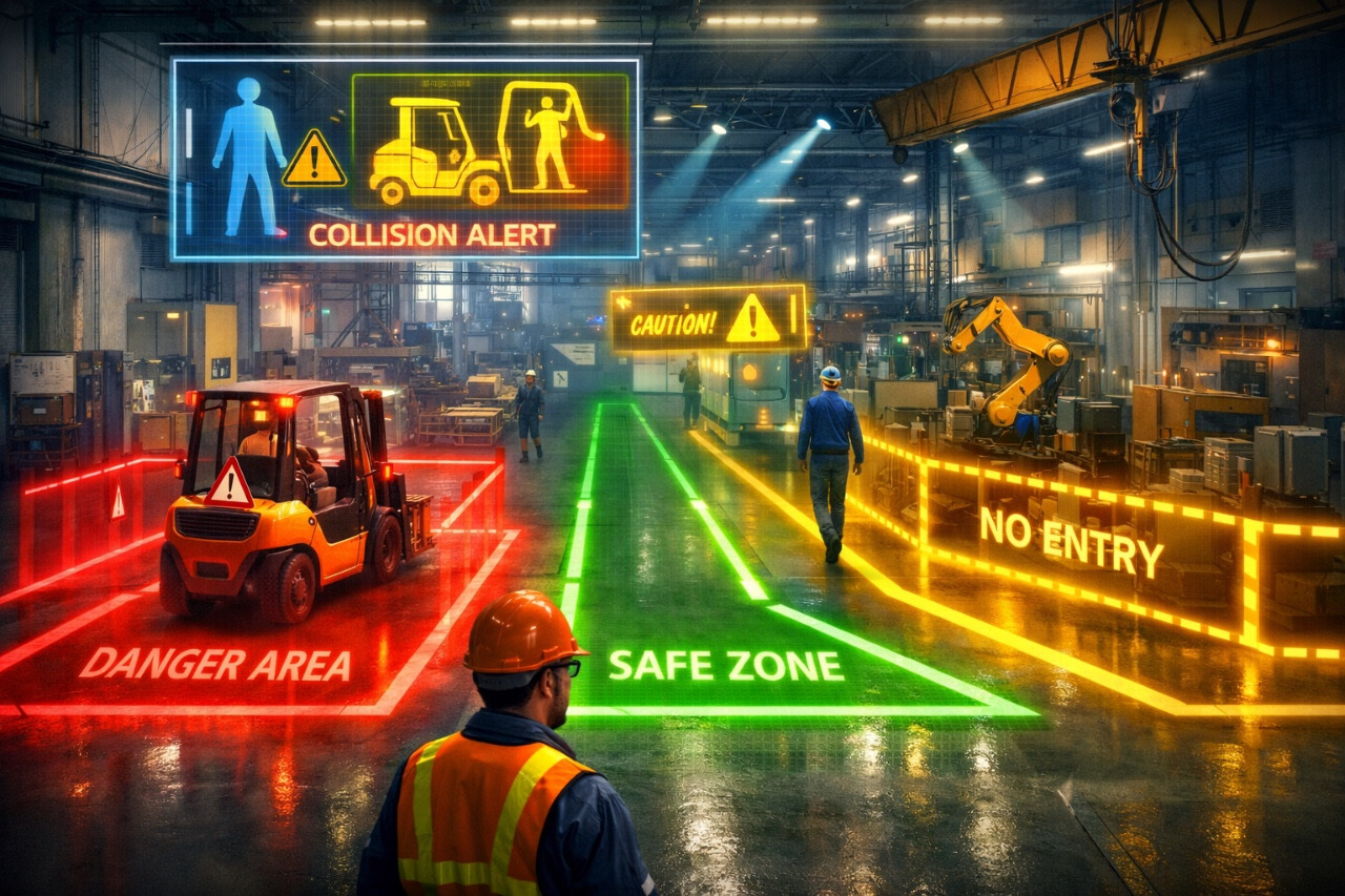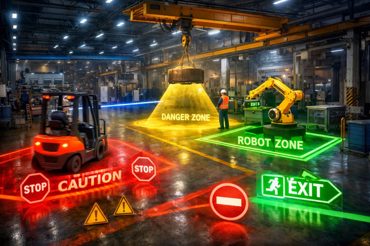 Визуальное обозначение опасных зон давно используется в промышленности: линии на полу, ограждения, знаки, предупреждающие таблички. Проблема в том, что физическая разметка быстро изнашивается, теряет читаемость и перестаёт восприниматься как сигнал опасности. Человек адаптируется к статичной среде и перестаёт её замечать.