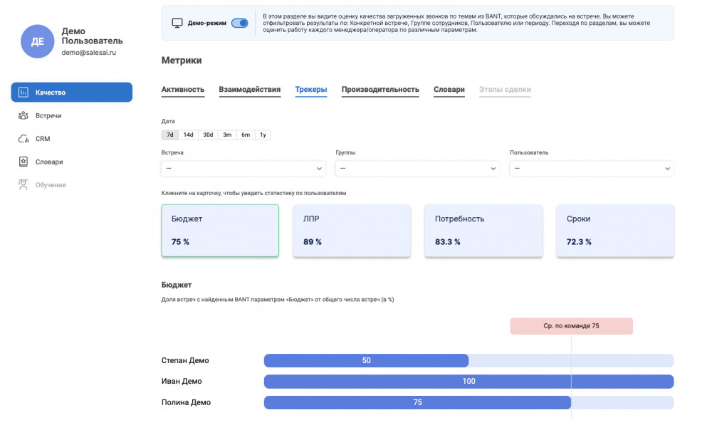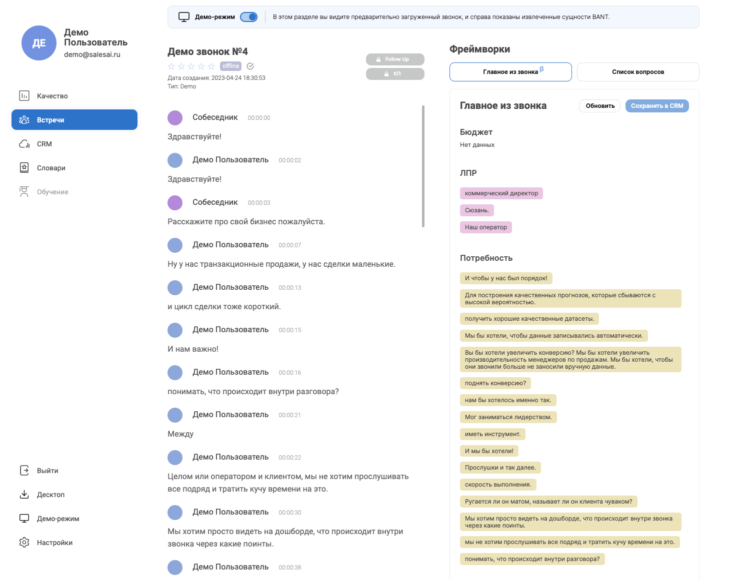 Ну а когда поймет, что такой научный прогресс именно для него, выключит демо-режим и загрузит свои стерео звонки. В ближайшем релизе, кроме киллер фичи с критериями квалификации, изменим флоу тестирования: тестирование будет ограничиваться не двумя неделями, а количеством загруженных звонков. Чем быстрее — тем лучше. Регистрируйтесь и получайте доступ к SalesAI бесплатно> И обратите внимание на этот скриншот: Справа подсвечено извлечение данных из звонка по фреймворку BANT. Менеджеру не надо заполнять эти поля ручками. Все заполняется само. Если вам необходимо заполнять другие поля и извлекать другие сущности — просто сообщите нам и мы сделаем кастомизацию системы под ваши требования. Тут подробнее: