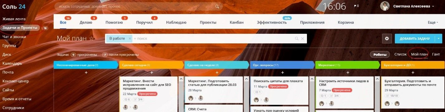 Чтобы найти эту страницу, выбираем в меню слева «Задачи и Проекты», далее из вариантов отображения всех задач («Список», «Мой план», «Гант») выбираем «Мой план».