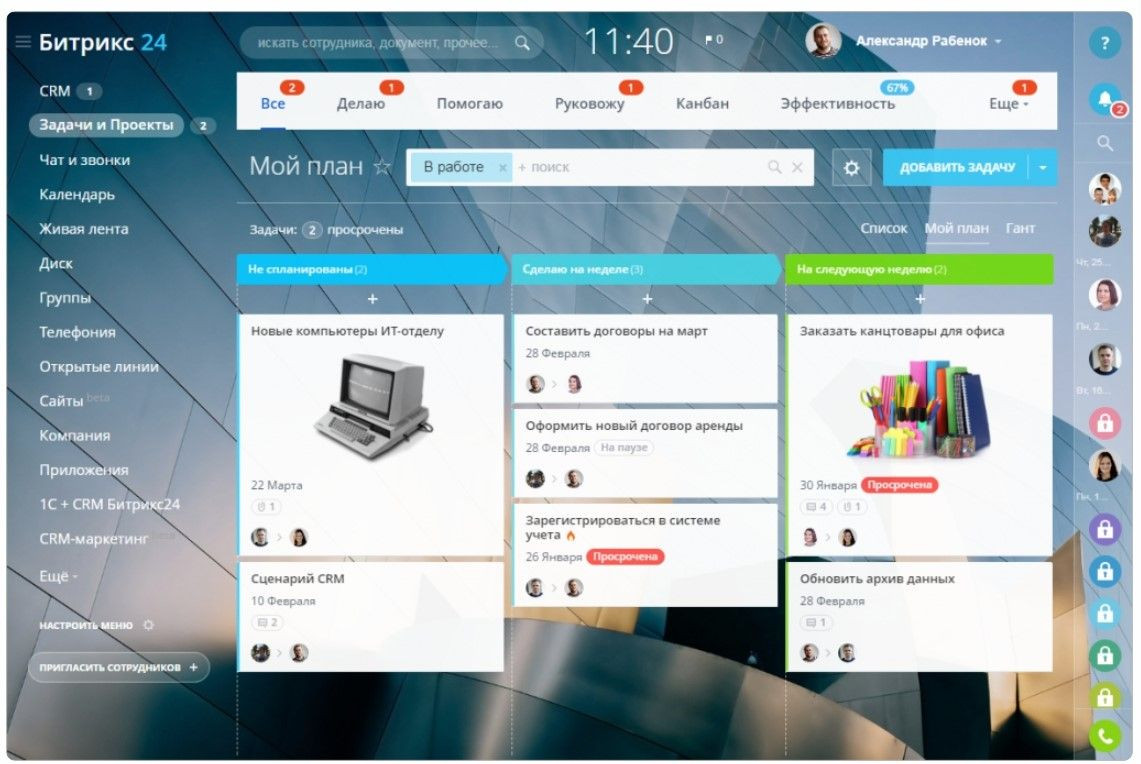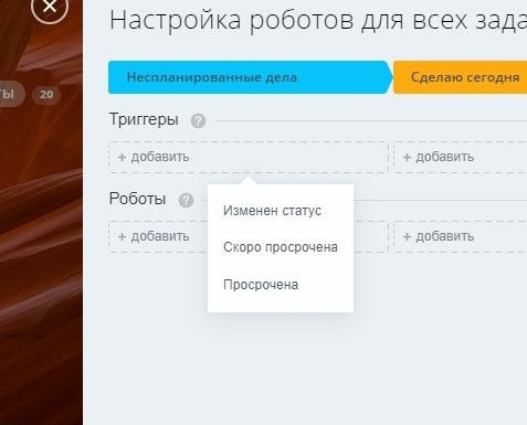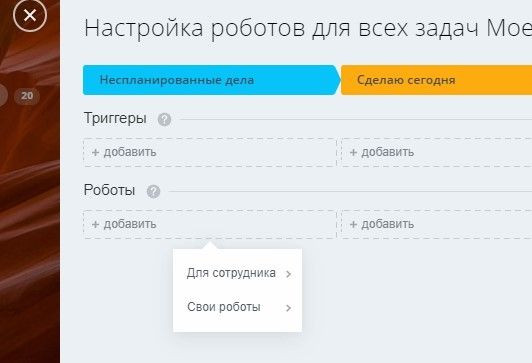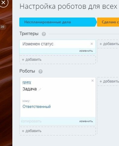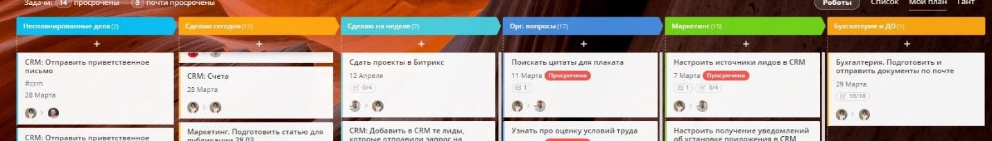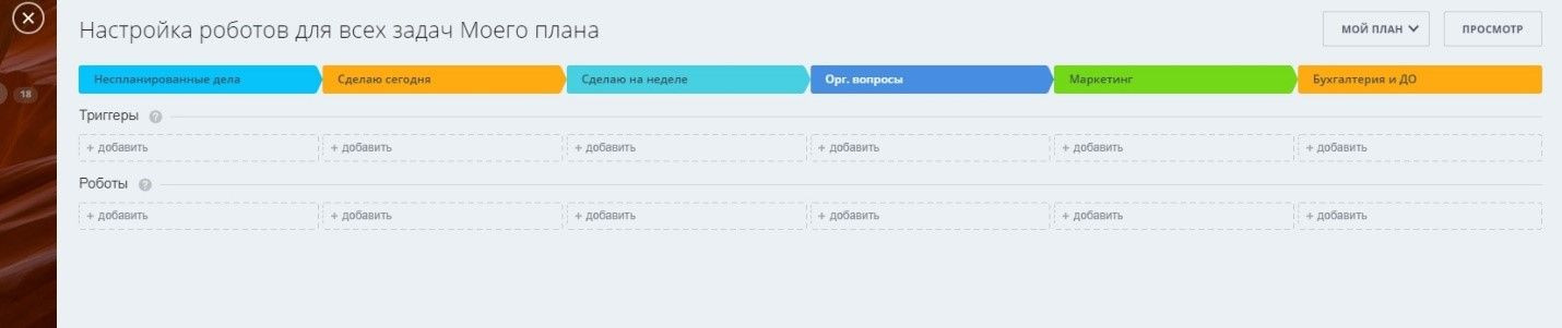 Добавьте каждой колонке свой уникальный цвет и название, чтобы разделение по стадиям выполнения было более наглядным. Нажав на значок карандаша в названии, можно переименовать стадию, изменить цвет или удалить стадию. Создавать задачи можно прямо в канбане и сразу на нужном этапе, нажав на значок + под названием стадии. Новая задача окажется первой в списке задач данной стадии. Далее работа с задачей идет в стандартном режиме. Если вы создаете задачи через функцию «Добавить задачу», то новая задача попадет в крайнюю левую колонку. Поэтому рекомендуем назвать данную колонку так, как указано в нашем примере «Неспланированные дела» (или «Не спланированы»), чтобы видеть и не потерять все новые задачи. Все задачи можно вручную распределять и перемещать по стадиям. Очень удобно отслеживать, на каком этапе работы находится та или иная задача. Над доской канбана располагается фильтр с поиском, с помощью которого можно выбрать и найти нужные вам задачи из общего объема задач. Если кто-то из коллег перейдет в ваш профиль на страницу задач, то он увидит названия колонок. При этом все ваши задачи коллеги не увидят. Им будут доступны только те задачи, где они являются участниками. Доступ ко всем вашим задачам имеют только администратор и руководитель. Вариантов по созданию канбана «Мой план» большое количество. Помимо базовых стадий вы можете создать свои стадии: — по направлениям (например, «Маркетинг», «Бухгалтерия» и пр.), — по периодам (например, «Сделаю сегодня», «Сделаю на неделе», «Сделаю за месяц» и пр.), — по видам деятельности как пример долгосрочного планирования, — по срочности, — задачи совместно с коллегами и пр. Пример 1 и 2 — наши варианты канбана «Мой план». Пример 1 Пример 2 Для более эффективной работы с задачами в канбане можно настроить такой инструмент автоматизации рабочего процесса, как «Роботы». На странице «Мой план» находим кнопку «Роботы», нажимая которую, попадаем на страницу «Настройка роботов для всех задач Моего плана». Здесь отражены все стадии задач. Для начала необходимо настроить триггеры. Триггер — это конкретное действие или ситуация, например, просрочка задачи. Как только эта ситуация произойдет, задача перейдет в нужную стадию. И уже на нужной стадии срабатывает настроенный Робот. Нажав на значок + добавить, нужно выбрать один из триггеров: 1. Изменен статус — как только задача перейдет в указанный статус, например, начнет выполняться, триггер передвинет ее в нужную стадию. 2. Скоро просрочена — триггер сработает, когда до крайнего срока задачи останется 24 часа и она не будет завершена. 3. Просрочена — триггер для тех, кто не любит следить за дедлайнами задач. Как только задача попадает в выбранную стадию, срабатывает Робот с действием. На каждой стадии может быть установлен свой триггер. Также есть возможность добавить несколько триггеров сразу. Теперь о настройке Робота. Здесь есть 2 пункта: «Для сотрудника» и «Свои роботы». Рассмотрим более подробно пункт «Для сотрудника». Какие действия доступны для роботов: 1. Задача — робот создает новую задачу. С его помощью удобно автоматизировать выполнение работ. Например, как только менеджер завершил задачу пополнения базы лидов и контактов, ему автоматически ставится задача по проведению рекламной компании. 2. Изменение документа — робот редактирует текущу