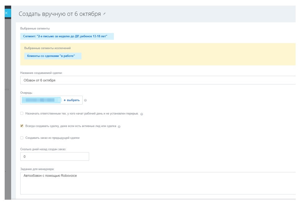 Получилась следующая схема работы: с помощью инструмента Генератор продаж в отдельном направлении «Автообзвон» по заданному сегменту генерируется группа сделок.