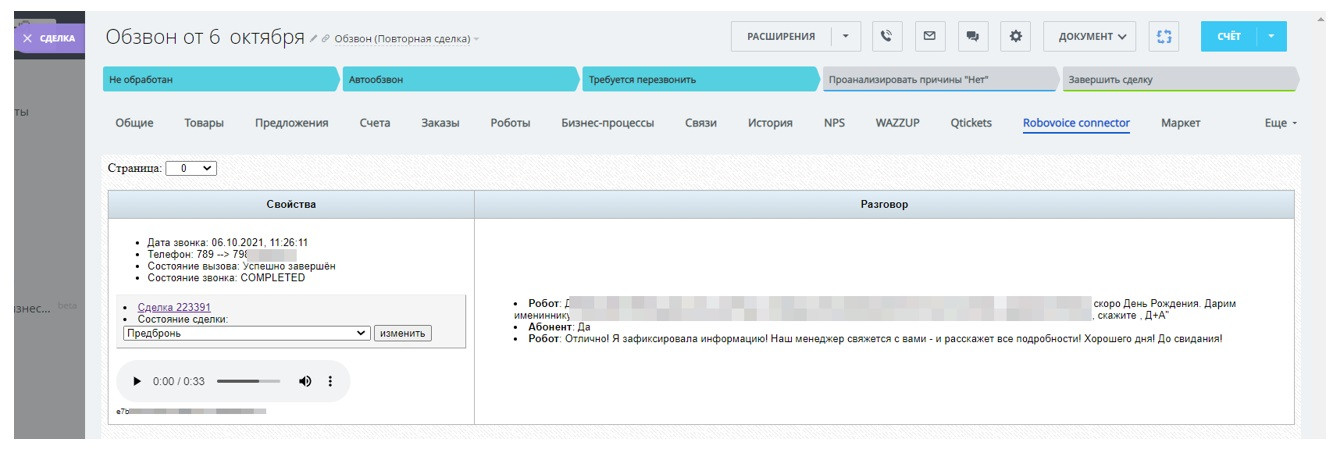 После этого все эти сделки находятся на стадии Не обработан. Далее менеджер запускает бизнес-процесс для старта автообзвона и скрипт по заданным критериям без каких-либо дополнительных действий совершает эти звонки автоматически. Полученные данные из разговора не просто сохраняются в карточке, а влияют на автоматизацию — состояние сделки. Если клиент ответил «Да» на вопрос: «Хотите подробностей нашего предложения?», то сделка переходит в стадию «Требуется перезвонить». Если клиент ответил «Нет» — автоинформатор уточняет причину и клиент может оставить комментарии. Информация сохраняется в сделке, которая переносится на стадию «Проанализировать причины». Если клиент не ответил или звонок по каким-то техническим причинам завершился неудачно — сделка переходит в «Провальную стадию». В результате, в карточке сделки звонок можно не только прослушать как исходящий вызов, но и просмотреть текст разговора, так как активити Robovoice «отдаёт» текст разговора. Наша команда готова прийти к вам на помощь в вопросах интеграций различных сервисов с Битрикс24, запуска CRM и настройках Битрикс24, консультациях и обучению по возможностям функционала Битрикс24 — обращайтесь!