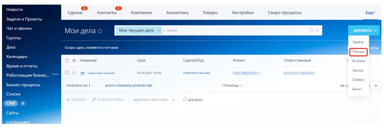 По умолчанию входящие письма станут Лидами (или сделками), а исходящие — Контактами.
