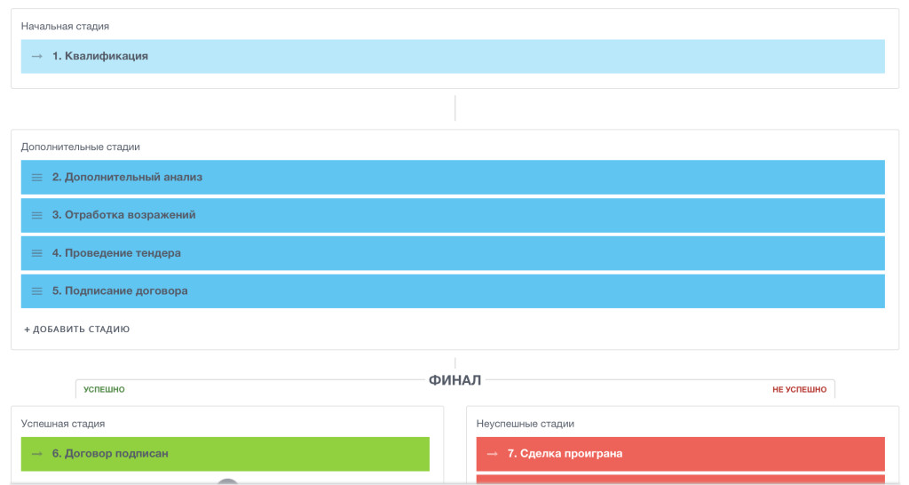 Можно было создать отдельную воронку под тендеры, но от неё отказались с целью упрощения работы с системой и оставили на будущее развитие.