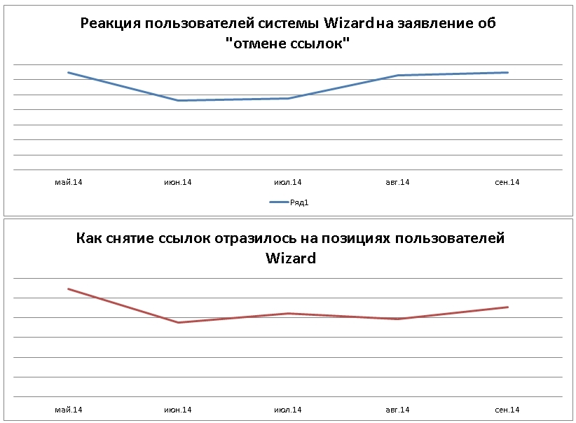 Многие оптимизаторы и владельцы сайтов потеряли большое количество позиций в поисковике из-за того, что поверили в этот миф. Не стоит удалять ссылки понапрасну, ведь вреда они точно не принесут. А вот о покупке новых ссылок следует хорошенько подумать, большинство экспертов по-прежнему продвигают сайты не без помощи этого способа. Мне попала в руки внутренняя статистика сервиса поискового продвижения Wizard. На графиках видно, как заявление отразилось на настроениях пользователей. Хочется заметить, что провал позиций последовал уже через месяц. Сайты снова стали наращивать ссылочную массу, но исходных позиций не достигли до сих пор.