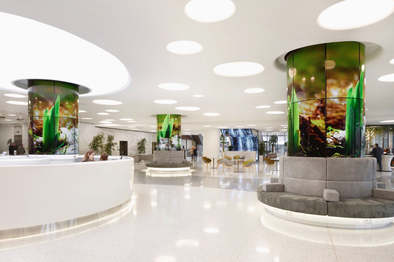 мониторинг потребления энергоресурсов, практикуется биофильный дизайн. Офисное