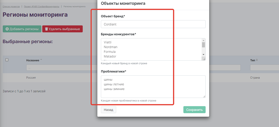 При запуске мониторинга откроется окно, где необходимо ввести основные параметры. Сервис сам настроит шаблон настроек по заданным параметрам с последующей возможностью редактирования.