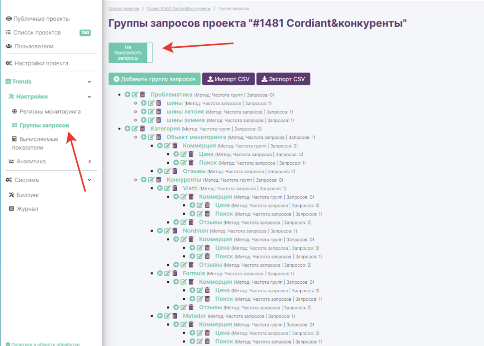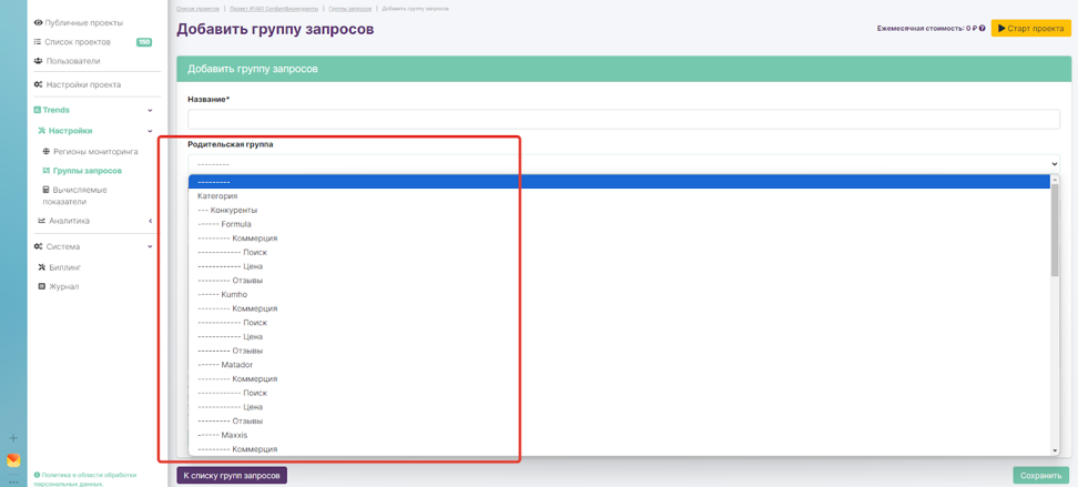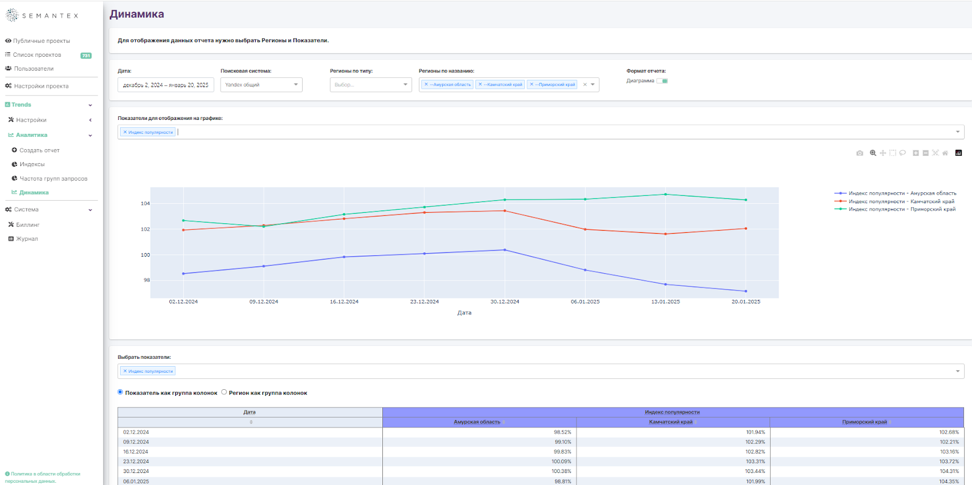 В Semantex.TRENDS есть несколько основных разделов: «регионы мониторинга», «группы запросов» и «вычисляемые показатели».