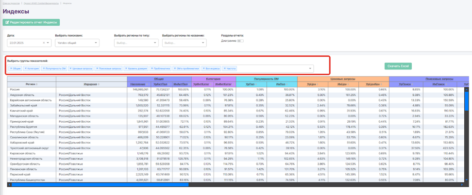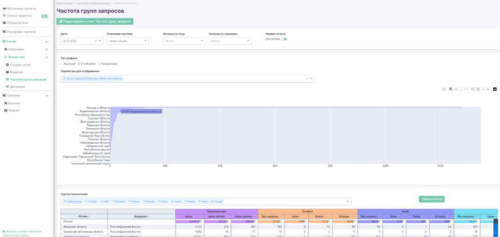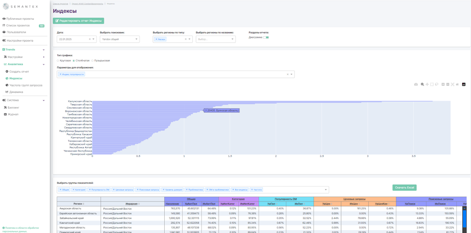 Допустим, мы хотим проанализировать спрос по шинам. В первой строке указываем наш главный объект анализа (например, бренд Cordiant). Далее указываем бренды конкурентов. В последнем поле указываем тематику/проблематику. Для добавления параметров по регионам нажмите «Добавить регионы». Найти нужный регион можно с помощью инструмента «Поиск». Также в шапке таблицы можно использовать фильтры «Путь» и «Тип». В любое время какие-то из регионов можно удалить в настройках проекта. Следующий раздел — «Группы запросов». Для удобства пользователей в проекте автоматически создается начальная иерархия групп для добавления запросов. Но вы можете добавить свои любые группы запросов и далее под них создать вычисляемые показатели. Все созданные группы можно редактировать. Основные правила при создании группы запросов: Перейдем к разделу «Вычисляемые показатели». Сервис уже предлагает вам шаблонные вычисляемые показатели. Можно изучить описание и настройки каждого показателя, нажав на «карандаш» справа. Кроме того, вы можете создать любой вычисляемый показатель самостоятельно, нажав на кнопку сверху «Добавить показатель». При начальной настройке проекта сервис предлагает следующие вычисляемые показатели: Теперь подробно расскажем, как же выглядят готовые аналитические отчеты, и какие разделы вы в них сможете найти. Первый раздел — «Индексы». Здесь представлены данные по всем вычисляемым показателям. Отчет можно смотреть как в табличном формате, так и в виде диаграммы. В верхнем поле можно воспользоваться фильтрами (дата, поисковая система, регионы по типу, регионы по названию). Независимо от способа представления данных, вы можете отфильтровать их по показателям. Это позволяет в удобной форме сравнивать данные объекта мониторинга с показателями конкурентов. Следующий раздел — «Частота запросов». Здесь отчет можно смотреть как в формате таблицы, так и в формате диаграммы. В отчете собрана статистика частотности заданных запросов за 30 дней — есть опция просмотра частотности в динамике за любой период. Данные также можно выгрузить в Excel-отчет. Раздел «Динамика»: все вычисляемые показатели можно смотреть в динамике. Тренды по показателям помогают быстро понять, что происходит со спросом в категории каждого региона и определить вектор мер для адаптирования стратегии к местным потребностям. Региональные тренды могут выявить уникальные предпочтения потребителей, которые могут сильно отличаться от общенациональных. Это дает возможность определять тренды контент-маркетинга, создавать более таргетированные рекламные кампании, оптимизировать ассортимент и повышать уровень вовлеченности. Кроме того, анализируя поисковые запросы, можно предугадать сезонные колебания спроса и предлагать актуальные решения в нужное время. Таким образом, бренды, следящие за региональными трендами и адаптирующие свои стратегии, могут увеличить свою конкурентоспособность и привлечь больше клиентов. Semantex.TRENDS — комплексное решение для автоматизированного и удобного анализа поискового спроса, позволяющее глубоко понимать потребности потребителей и стратегически руководить своим брендом, выбирая наиболее перспективные направления для роста и развития. Адаптированность и масштабируемость данного инструмента делают его подходящим как для крупн