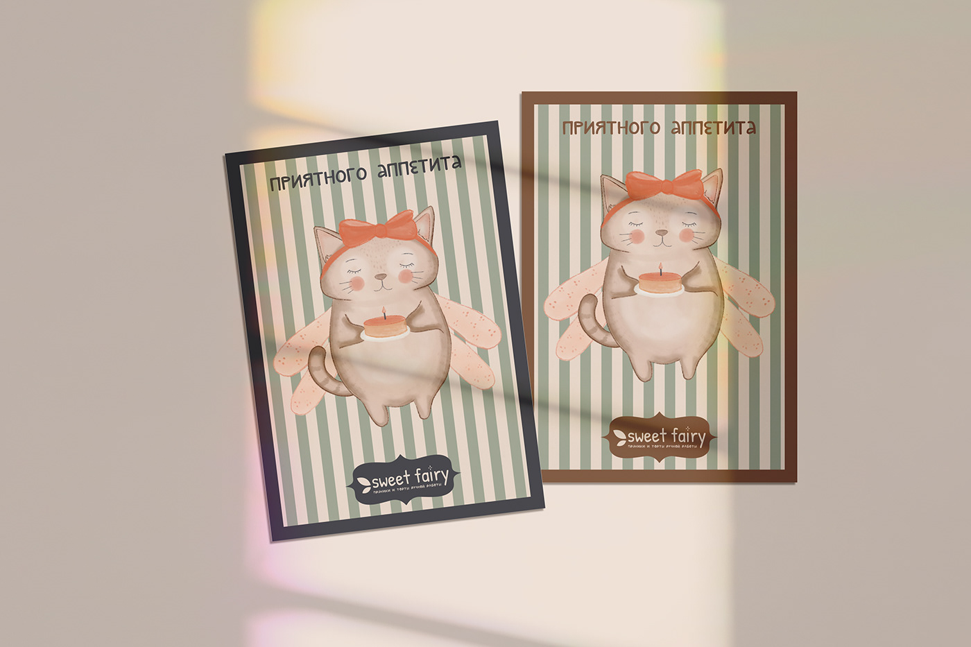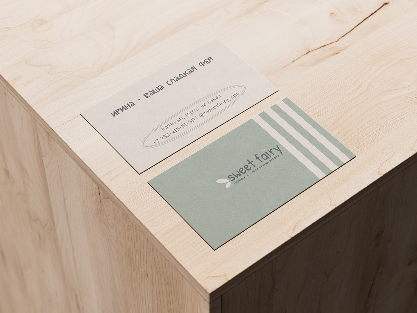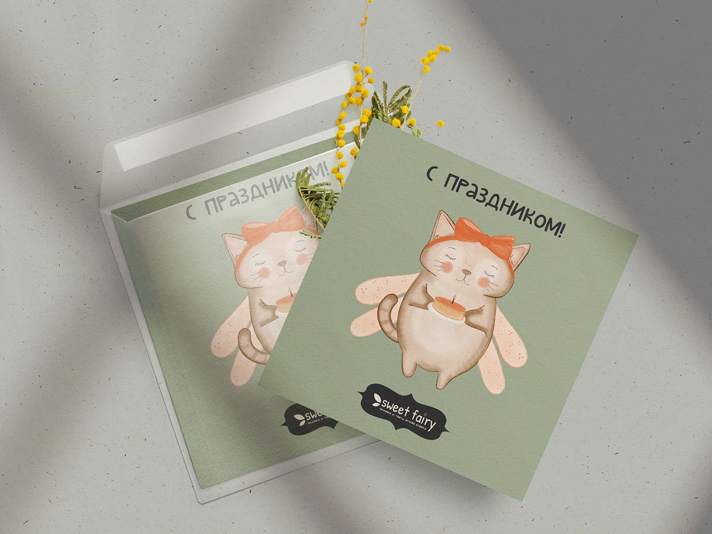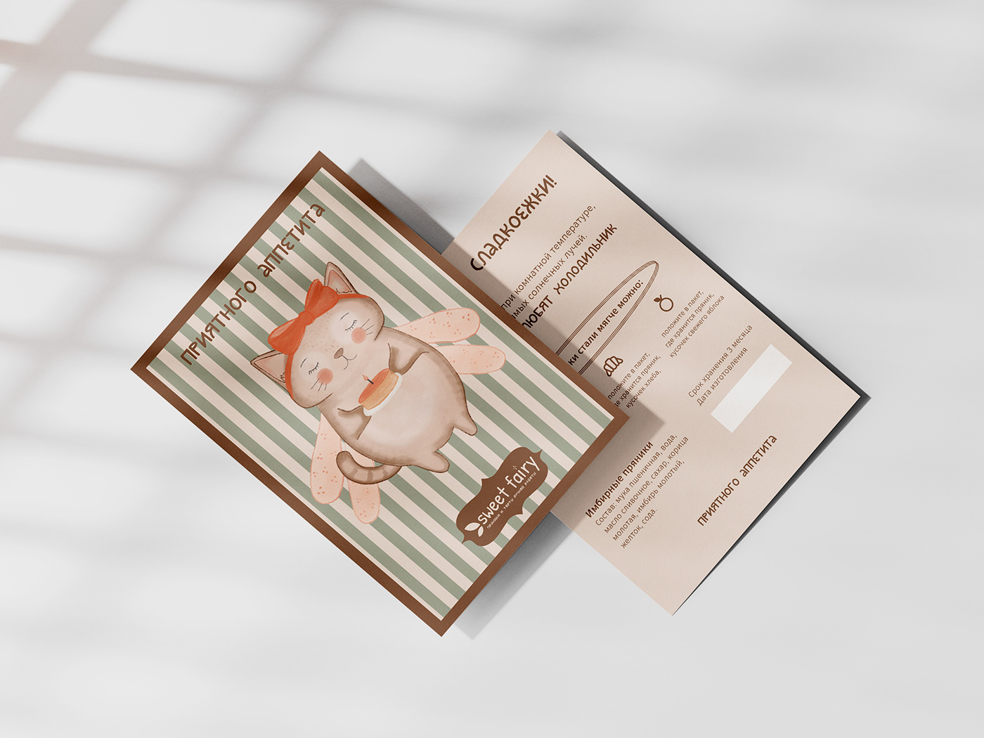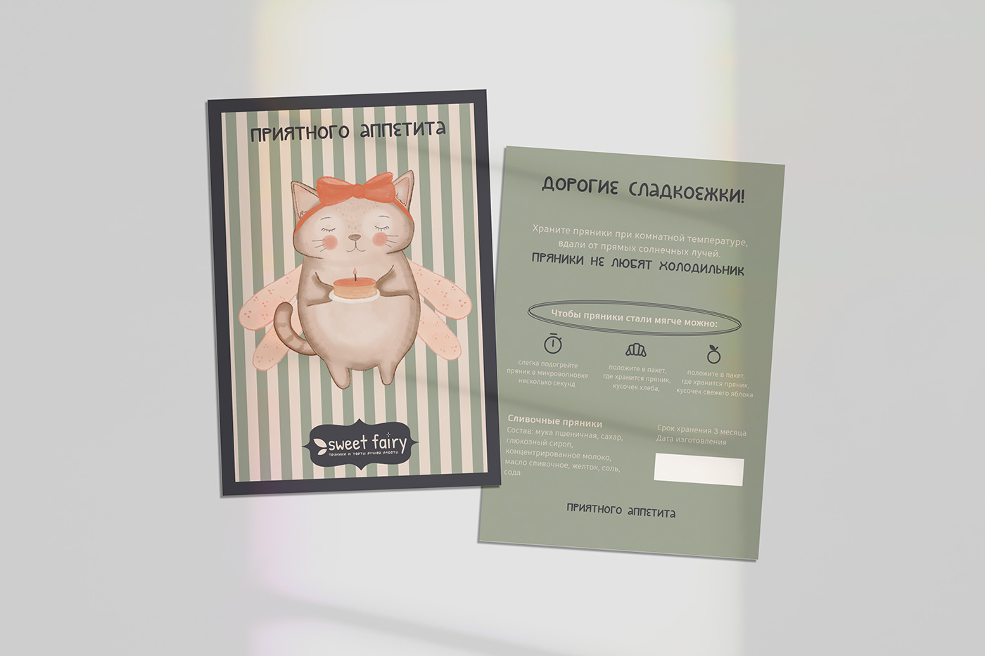 ЛоготипДля логотипа подобрали два вида шрифта похожих на рукописные — более простой для названия, чтоб легко считывалось, хорошо пропечатывалось штампом и дескриптор на кириллице более динамичным. Не смотря на то, что оба шрифта достаточно яркие сами по себе и имеют отсылки к рукописным они хорошо сочетаются и не спорят благодаря балансу. МаскотСначала рассматривались варианты фей в человеческом виде, но когда заказчица сказала о любви к животным и что ее фирменные пряники — с котами, сошлись на мнении, что фея должна быть кошкой. Важно, чтоб иллюстрация была оригинальной — это позволит закрепить образ бренда. Стилистика — акварельная иллюстрация — пожелание заказчицы. Фирменный стильКак и остальные элементы дизайна фирменный стиль, цветовая гамма сложились из пожеланий заказчицы и отлично решает все важные задачи. В основу легли зеленый, серо-синий, пыльно-розовый. В качестве фирменных элементов использованы паттерн в виде полоски, плашка-рамка под логотип и обводка важных моментов, напоминающая как обводим важное в записях ручкой. Разработана универсальная открытка «с праздником», наклейка-напоминание «поставь меня в холодильник», штамп для брендирования упаковки. Для коробки с тортами и пряниками придумали оборачивать бумажной лентой-этикеткой и брендировать штампом с напоминанием о сроке годности. Дата изготовления будет прописываться в ручную. Дизайн имеет отсылки к трендам 15-16 годов к сканди эстетике и рукотворным элементам — это привлечет именно нужную целевую группу по возрасту и полу и интересам. Спасибо за внимание!