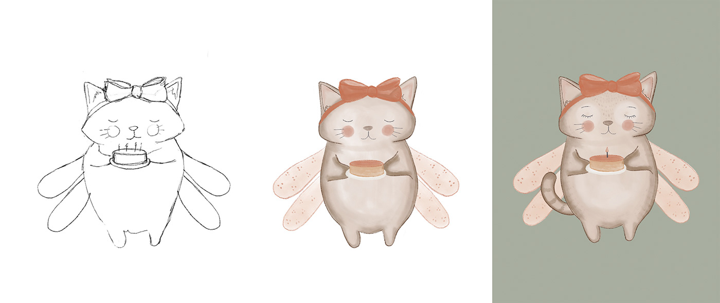 Среди пожеланий глубокие сложные цвета, создающие уют. Иллюстрация персонажа в акварельной технике. Исходя из названия бренда «sweet fairy» (пер. «сладкая фея») в пожеланиях было внести атрибутику фей — крылышки.