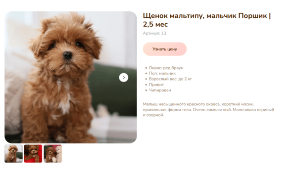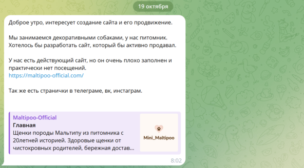 «В месяц может упасть одна заявка с сайта или обращение вотс ап и всё. За всё время с сайта не было не одной продажи. Мы более 15 лет занимается разведением щенков Мальтипу, щенки всегда есть в наличии, но вот с маркетингом проблемы и никак не можем найти специалистов, которые могут дать результат и будут отвечать за свою работу»