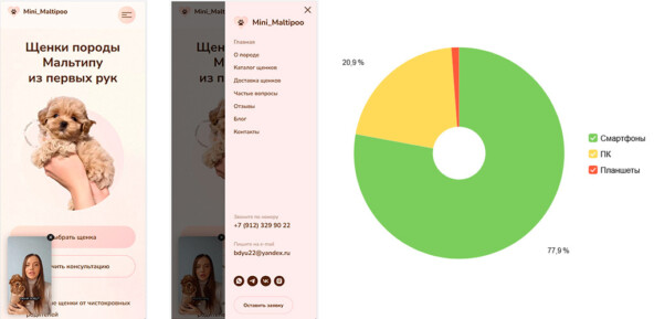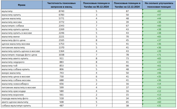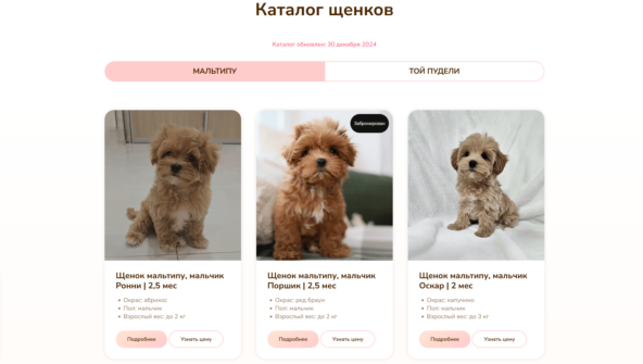 Познакомились с владелицей питомника в одном из бизнес-клубов летом 2024 года. Дарья ходила на школу SEO продвижения которую я веду оффлайн в Москве. Потом связь потерялась, она мне написала в середине октября 2024 скрин ниже: Потом мы встретились, Дарья рассказала, что стороння web компания делала лендинг, потом переделывали, пробовали запускать контекстную рекламу — это не привело к успеху.Со слов владелицы питомника: Ну что ж подумал я... вызов принят! Так же на встрече Дарья рассказала, что у них есть услуга по доставке щенков по всей территории РФ. Основная аудитория питомника это девушки 25-45 лет. Одностраничный сайт, не проработанная «самоделка» предыдущих подрядчиков. Нет заказов, нет поисковых позиций в ТОП, нет трафика, нет продаж. К работе команда приступила в первых числах ноября 2024, дата сдачи проекта была 25 ноября 2024 т.к. заводчица хотела щенков, которые подрастают разместить к этой дате на новом сайте. Всегда разработка и SEO продвижение в агентстве начинается с комплексного анализа конкурентов. Как минимум надо понимать кто у нас в соперниках. Всего проанализировали около 40 сайтов питомников конкурентов по всей стране. Если коротко, то среди конкурентов всё было печально в плане маркетинга и рекламы. Сайты простенькие, местами кривые, НО была пятёрка игроков, которые были в ТОП-5, ТОП-10 поисковой системы Yandex и Google. Их анализировали с особым пристрастием. Для успеха в SEO, контекстной рекламе, продвижения на авито, при написании статей на сторонних ресурсах типа VC или Dzen везде нужно понимать по каким поисковым запросам мы будем продвигать проект, давать рекламу, писать статьи — всегда и везде!)) Источники сбора поисковых запросов: С сайтов конкурентов, да мы можем узнать по каким поисковым запросам продвигаются конкурентов, а также из спец сервисов (pixeltools, keys.so), сервисов статистики, аналитики и конечно же из wordstat.yandex.ru Собрали 2500 поисковых запросов и упаковали их в наш фирменный файл семантики, где любому заказчику всё понятно и наглядно. И самое главное заказчик может им пользоваться. В результате анализа конкурентов, пришли к выводу что можем реализовать проект на конструкторе Тильда. На основании анализа конкурентов и собранных поисковых запросов нужно было спроектировать будущую структуру сайта для выхода в ТОП 5 Yandex и Google по всей территории Российской Федерации т.е. нужно было учесть нюансы по региональному продвижению и заложить этот функционал на этапе разработки сайта т.к. С собранной аналитикой и пожеланиями Дарьи приступили к разработке дизайна. Был собран список типовых страниц, которые нужно отрисовать дизайнеру. В данном проекте таких страниц 10 На основании опыта команды агентства в разных нишах, плюс анализа системы статистики Yandex Metrica заказчика. Отдельно прорабатывали мобильную версию сайта т.к. большая часть трафика будет приходить именно с мобильной версии. В питомнике всегда появляются животные (щенки или котята не имеет значение) любые животные. И на сайте для успешного продвижения нам нужен актуальный каталог питомцев, которые в продаже либо уже проданы. На этом этапе питомнику нужно на регулярной основе делать фотографии и видео питомцев. Обговорили с Дарьей в каком формате она будет скидывать фотографий и видео щенков чтобы на сайте всё было стандартизировано, и мы подготовили функционал под это. Так