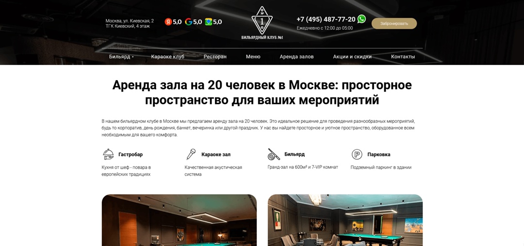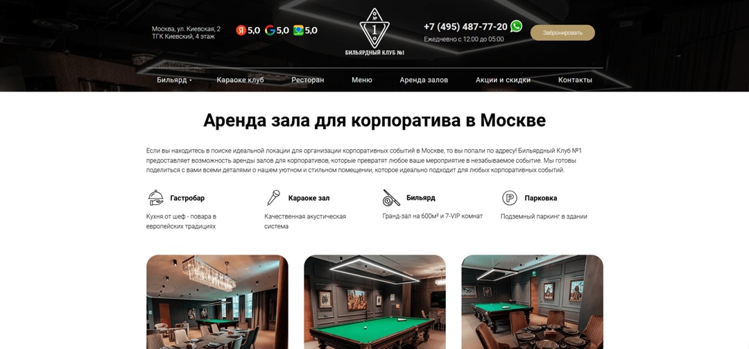 Брифинг был в офисе заказчика за чаем) общались около 3, 4 часов.Основные услуги: аренда бильярдных столов, аренда VIP комнат с бильярдными столами под мероприятия (дни рождения, корпоративы и т.д.), на этой же территории есть караоке клуб. Решение задачи:Разработка многостраничного сайта на основании анализа конкурентов и собранной семантики для охвата всего поискового трафика в нише заказчика