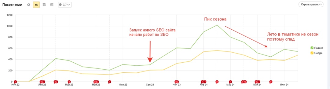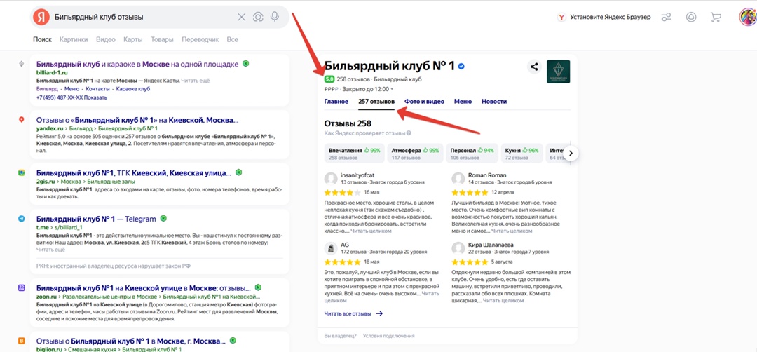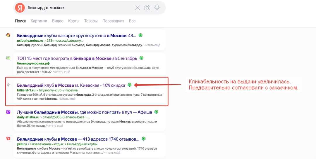Ниже скрин из сервиса keys.so уже ПОСЛЕ проведенных нами работ. Из скрина видно наш клиент billard-1.ru имеет больше всего запросов в ТОП-10. Источники для сбора поисковых запросов, которые использовали:- c сайтов конкурентов- сформировали список поисковых запросов исходя из брифинга заказчика и его услуг- wordstat.yandex.ru + правая колонка- поисковые подсказки Yandex и Google- Блок «с этим запросом искали» в выдаче поисковых систем- Yandex metrica — Webmaster Yandex- Спец сервисы: keys.so, букварикс, pixeltools, spywordsДалее была чистка от нецелевых запросов, в конце кластеризация (группировка) На основании анализа конкурентов и собранной семантики составили структуру будущего сайта. Запроектировали отдельные страницы под аренду залов на проведение торжеств: Аренда зала на день рождение; Аренда зала на корпоратив; Аренда зала на мероприятие и т.д. также есть отдельный поисковой спрос под аренду площадей по численности персон: аренда зала на 10 человек; аренда зала на 20 персон; аренда зала на 50 человек т.д. Аналогичным образом были проработаны все группы из семантики для охвата всех поисковых запросов. На момент начала разработки сайта, у заказчика был разработан лендинг на Tilda в фирменных цветах бильярдного клуба. Его и взяли за основу и далее всю структуру будущего сайта разворачивали на основании это стиля. Страницы основных услуг: Страницы под аренду ВИП залов: Страницы под аренду залов на мероприятия: Страницы под аренду залов по численности персон: и другие типы страниц На момент старта не было качественных фотографий клуба и караоке, обговорили что нужно провести фотосессии всего бильярдного клуба. Заказчик ответственно подошел к этому вопросу)), проводилось несколько профессиональных фотосессий бильярдного клуба, VIP комнат и караоке клуба. Все фотографии использовались в заполнении сайта. Под необходимые страницы и кластера семантики написали тексты. Под каждый текст составлялось отдельное техническое задание на основании анализа ТОПа. Заполнили мета теги (title, description), заголовки H1-H6. Подключили к сайту Telegram. Все заявки падают менеджеру бильярдного клуба и дублируются управляющему и директору в бот в телеграме — чтобы быть в курсе о количестве заявок.Подключили Yandex metrica, настроили цели на отправку форм, тап на номер телефона, переход в мессенджер. Настроили webmaster.yandex.ru, google search console Совместно с заказчиком просмотрели все страницы сайта на какие-то неточности и ошибки. Всё поправили. Передали заказчику все доступы от сайта, систем статистики. В агентстве все работы стандартизированы, с тематикой бильярда команда была уже знакома. Поэтому всё было по накатанной, из интересного могу показать что для улучшения поведенческих факторов на выдачи Yandex, применили такой лайф хак)) Прописали в title главной страницы, информацию о скидке, выглядит это так: Следим за отзывами в интернете и на ГЕО сервисах. На Yandex картах у нас 5.0, 257 отзывов на момент написания этого кейса. После разработки сайта приступили к SEO продвижению. Звонки, заявки за первые 3 мес SEO продвижения: 1200 звонков; 390 заявок; Сайт находится в ТОП — 5 в регионе Москва, по запросам: Бильярдный клуб, Бильярд в Москве Алексей Штабкин. Генеральный директор (CEO) Так получается, что к нам в агентство приходят часто проекты на переделку лендингов на Тильде в полноценные сайты под SEO на Тильде, что мы уже имеем много экспертности в этих 