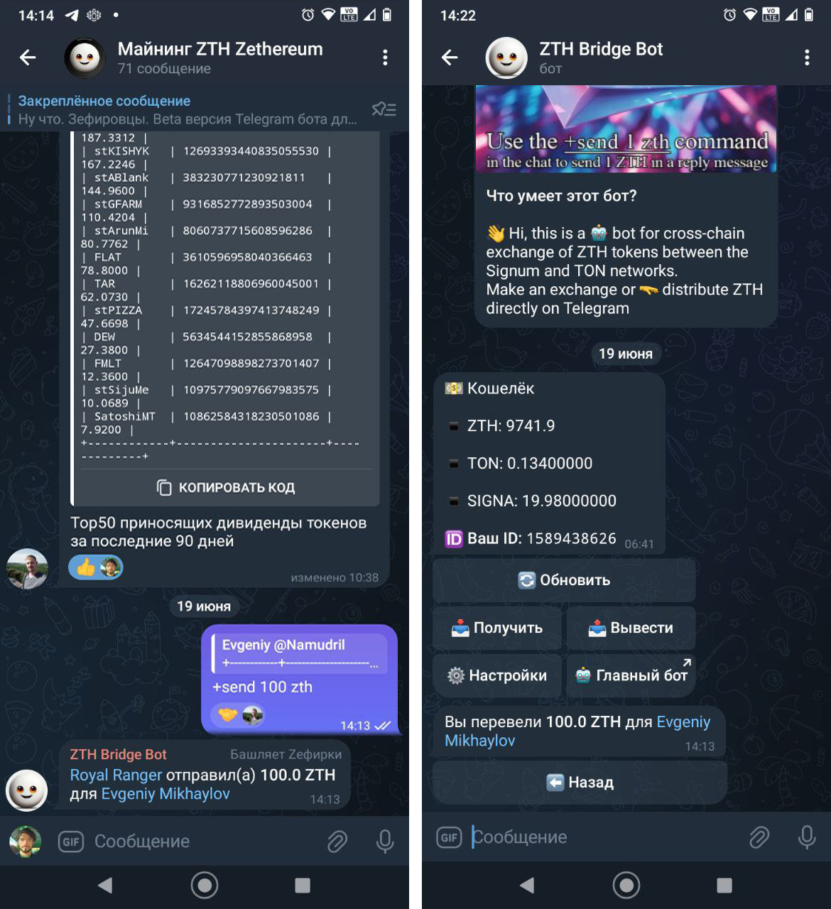 Как для админа, для вас должно быть легко и просто отправлять крипту прямо участникам вашего чата, а для них должно быть легко и просто ее получить, а затем вывести на личный крипто кошелек. Для этого был разработан Telegram крипто бот @Zethereum_bot. Просто добавьте его в ваш чат, дав ему админ права, и с помощью этого бота вы сможете раздавать токен ZTH прямо в ответных сообщениях в чате. Токены будут поступать на личный счет абонента в меню бота, откуда он в любой момент сможет вывести их в блокчейн сеть TON или Signum (Бот также выполняет функцию кросс-чейн моста). Для того чтобы отправить, например 100 ZTH достаточно в ответном сообщении написать +send 100 zth Абонент тут же получит зачисление на свой счет. Ну и конечно же, для того чтобы отправлять ZTH другим участникам чата, ваш баланс ZTH в боте должен быть положительным. Также, для того, чтобы вывести полученные ZTH из бота на свой крипто кошелек, абонент должен будет пополнить счет бота нативной монетой сети в количестве достаточном для оплаты комиссии на вывод (В сети Signum — это 0,1 SIGNA, в сети TON — это 0,1 TON). Купить и продать ZTH можно легко двумя способами.В сети TON на DEX бирже DeDust пара ZTH/TONВ сети Signum на DEX бирже SignumSwap пара ZTH/SIGNA И напоследок, способ номер 3. Что немаловажно, поддерживайте позитивную атмосферу в чате. Дружелюбное, вежливое и уважительное общение между участниками привлекает новых пользователей и мотивирует старых приглашать в чат своих знакомых. Важно помнить, что успешное мотивирование подписчиков требует усилий, финансовых вложений и постоянной работы. Поэтому будьте открытыми, активными, щедрыми и готовыми в любой момент вступать в диалог с вашей аудиторией.