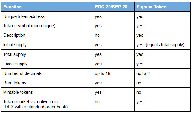 Большинство блокчейнов используют смарт-контракты для создания токенов и выполнения различных действий, таких как покупка, продажа и передача. Подход Signum в этом вопросе отличается своей уникальностью. В блокчейне Signum токены расположены аналогично собственной монете блокчейна (Signa), поскольку они также являются уникальными объектами, которые могут быть переданы или обменены непосредственно между учетными записями. Их расположение не создаётся с помощью смарт-контракта, а привязано напрямую к учетным записям.