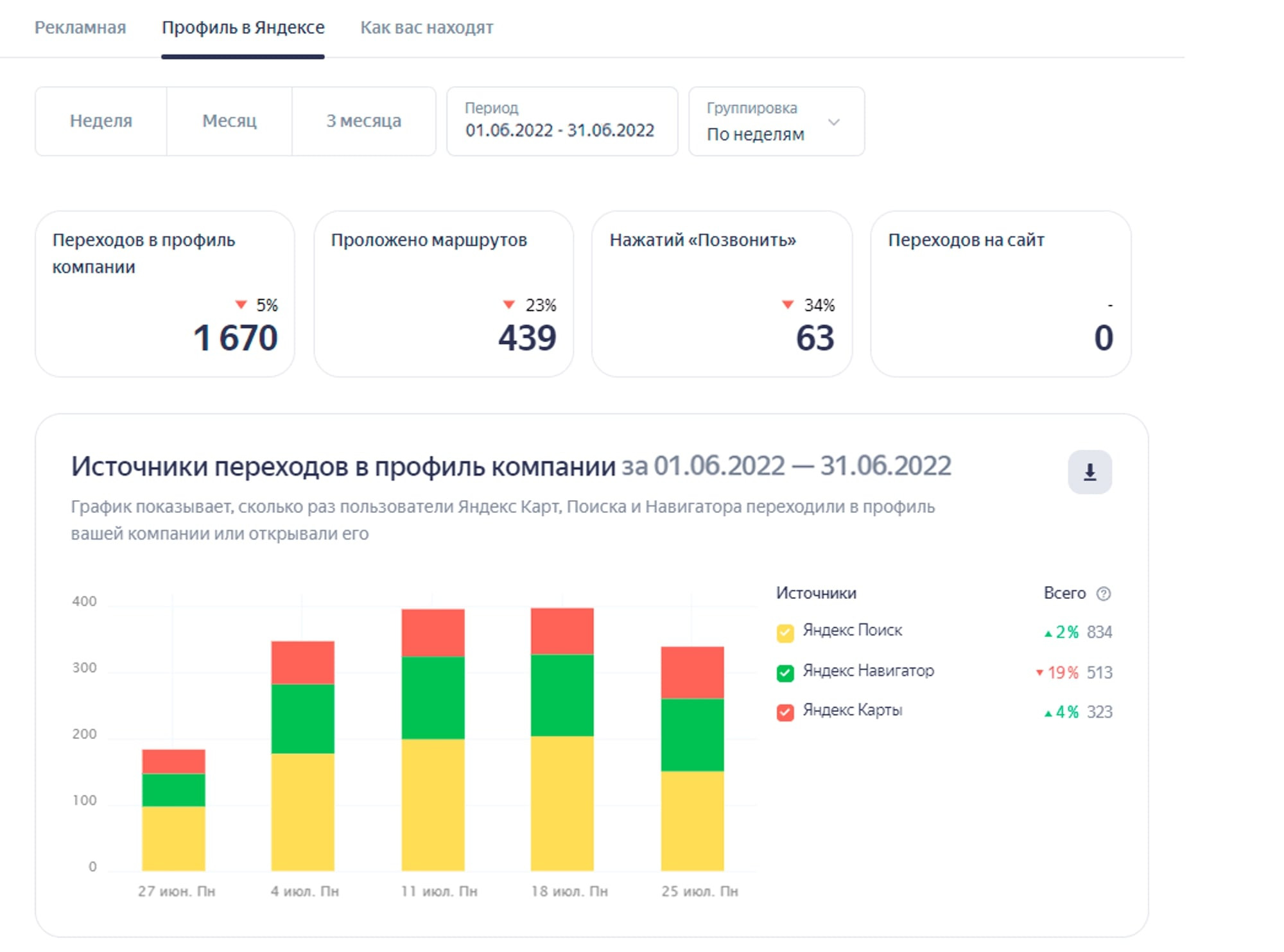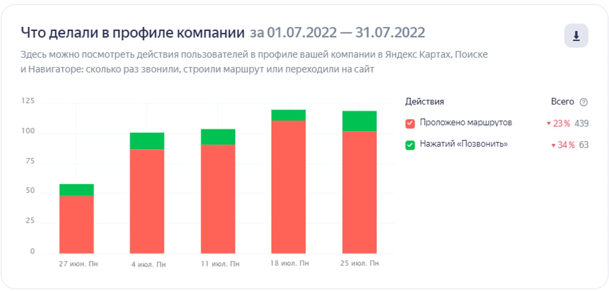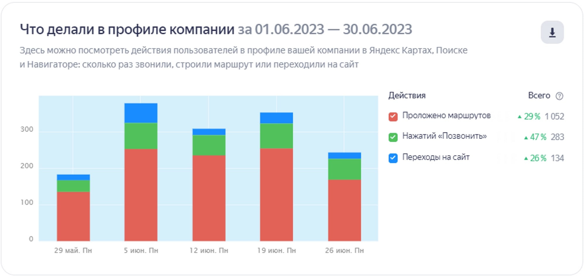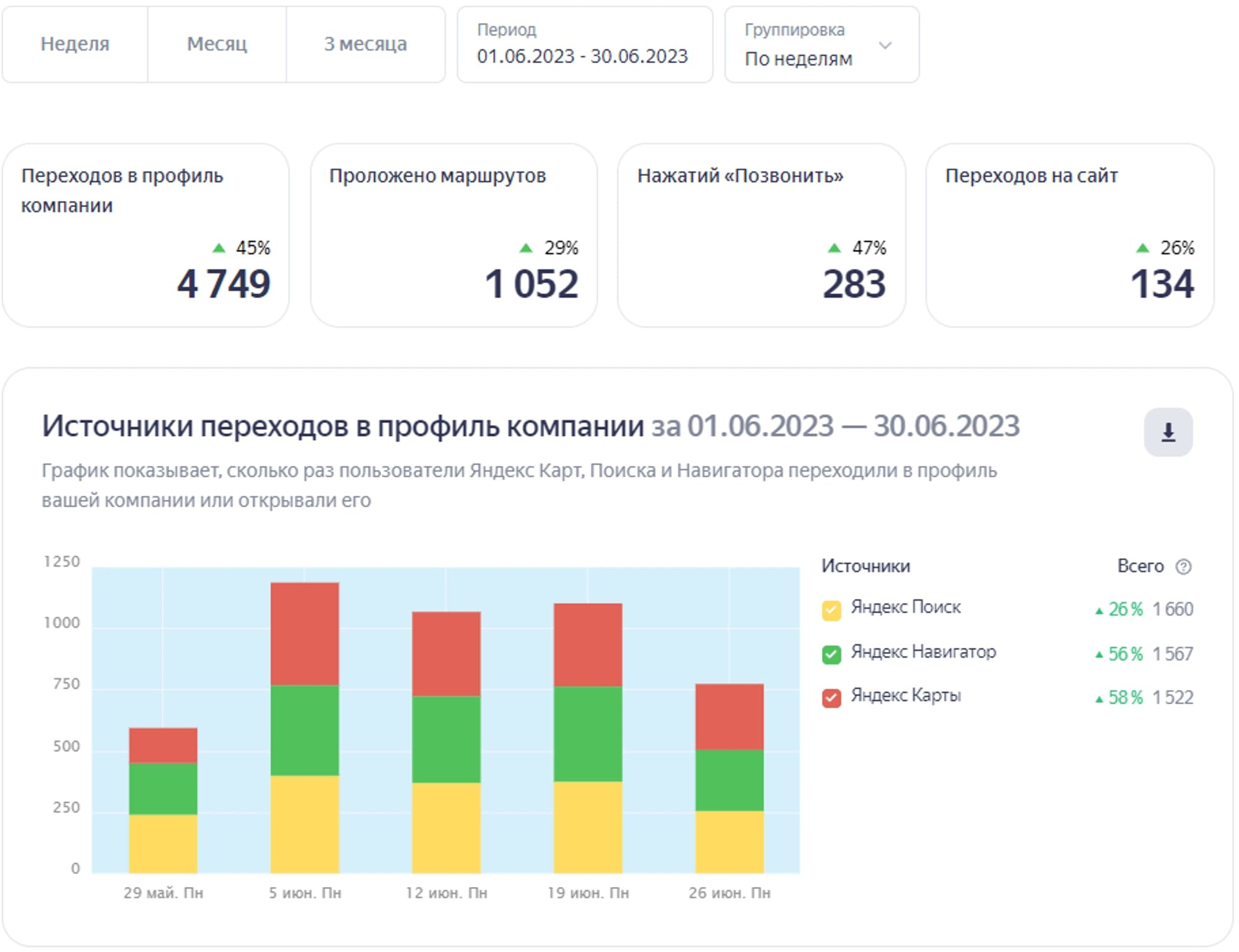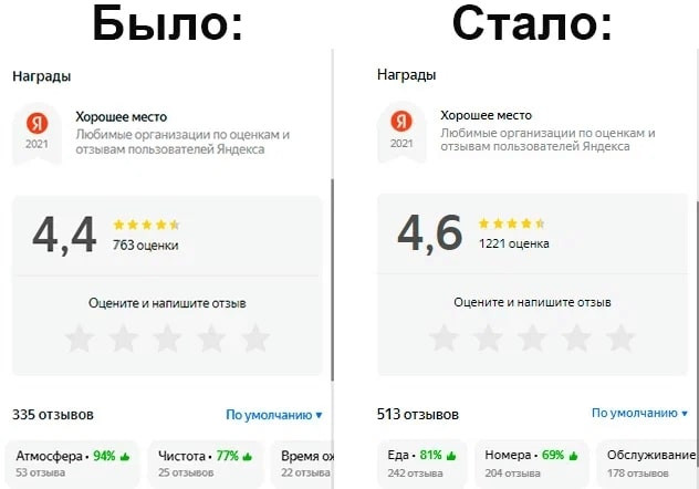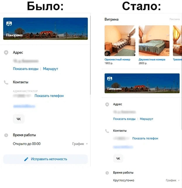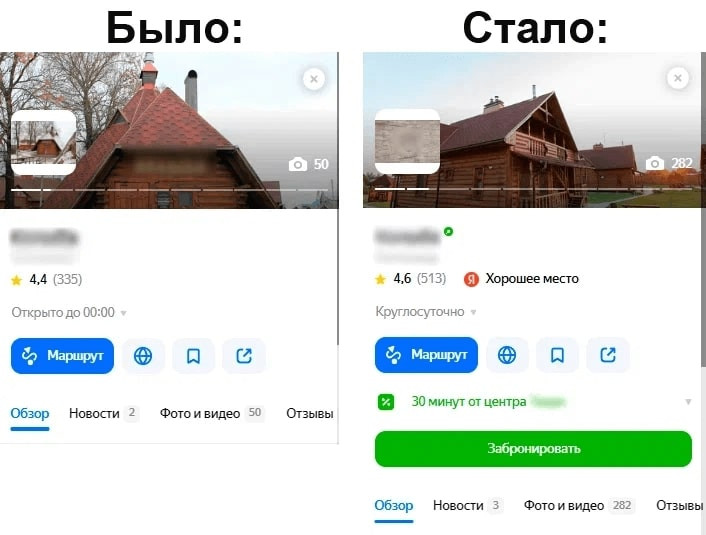 Первым делом проработали фото объектов (гостиница, гостевые домики, кафе, банкетный зал) с логичной расстановкой. Видя актуальные фотографии, посетители смогут отметить плюсы: оценить номера и холл отеля, рассмотреть оформление банкетного зала и т. д. Это простимулирует их на дальнейшее изучение карточки. На втором шаге поработали с разделом «Товары и услуги», где в деталях расписали услуги, которые предоставляет организация. Посетители видят подробное описание и сразу имеют возможность оставить большее количество релевантных запросов, например, по номеру телефона. Кстати, это одновременно работает в пользу сбора контактных данных пользователей. Посетителям недостаточно посмотреть приятные фото и почитать описание услуг. Необходимо дополнительно поработать над завоеванием доверия, а значит пора показать, что бизнес охотно идет на контакт с клиентами. Мы проработали не только конверсионные этапы, но и коснулись вспомогательных персональных факторов, помогающих в выгодном свете показать клиентам детали бизнес-сферы и нюансы бизнеса заказчика. Но чтобы понять такие нюансы, потребовалось для начала проанализировать процессы взаимодействия посетителей с карточкой организации, а также определить среднюю оценку релевантности карточки с точки зрения пользователей. По итогам упорной работы наших специалистов карточка организации поднялась с 14-го на 7-е место по релевантным запросам в локальной выдаче, а также обеспечила увеличение числа новых посетителей (т. е. потенциальных клиентов компании-заказчика). Сравним показатели за июнь 2022 года с показателями за июнь 2023 года. Один и тот же месяц берем специально, чтобы сезонность спроса не влияла на истинную результативность. ИЮНЬ 2022 года: ИЮНЬ 2023 года: Поясним цифры, приведенные в визуальном выражении в виде столбчатых диаграмм, более живым языком: Приведенные цифры подтверждают, что качественная проработка карточки организации связана с улучшением показателей бизнеса, а значит оказывает прямое влияние на рост прибыли. Результаты также положительно сказываются на росте трафика не только в карточке, но и обеспечивают рост трафика с сопутствующим увеличением количества лидов и конверсий на сайте организации. Выводы: нововведения Яндекса, определяющие условия присутствия компаний в геосервисе, дарят новые возможности для развития бизнеса. Если правильно подойти к оформлению карточки на Яндекс Картах, то за 1 год можно превратить её в эффективный маркетинговый инструмент. Результатом станет первоклассная отстройка от конкурентов и повышение прибыли.