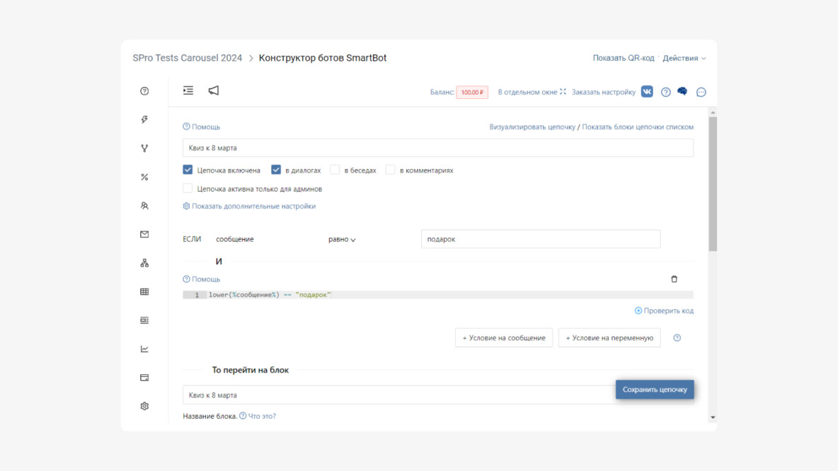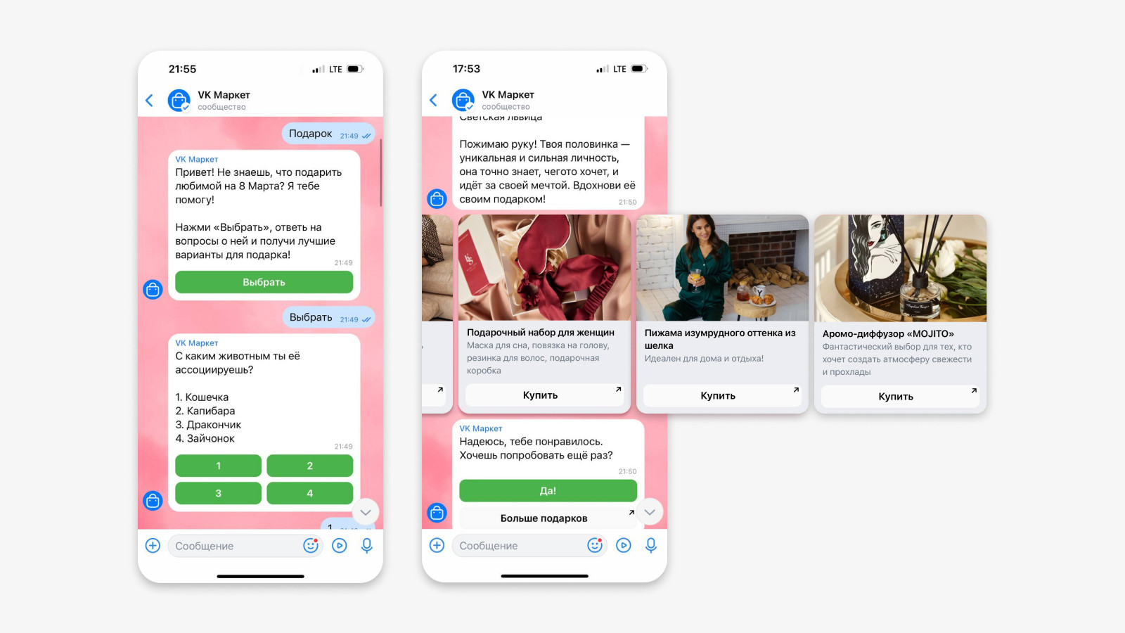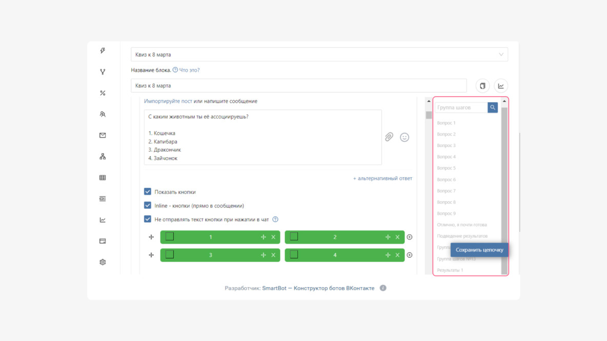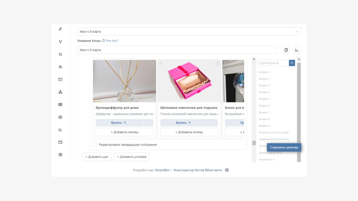 Вопросы помогали узнать интересы девушки — какое любимое животное, место отдыха, сериал и другое. На основе ответов чат-бот отправлял подходящие варианты подарков. Например, для домоседок была собрана подборка из товаров для дома: диффузоры, посуда, подушки. А для любительниц активного отдыха — спортивные костюмы, аксессуары и сумки. Отправленную подборку пользователь мог «прокрутить» внутри чата. Smartbot VK — первая версия Smartbot, работающая только для ВКонтакте. Из нее уже вырос конструктор Smartbot Pro — многоканальная платформа, позволяющая запускать чат-ботов в Telegram, ВКонтакте, Viber и Jivo. Сначала мы создали стартовый блок — внесли название, указали параметры и задали команду «подарок» для активации бота. Далее мы подготовили девять вопросов — цепочку шагов, благодаря которой бот общался с пользователями. Названия этапов отображались с правой стороны, что облегчало навигацию по всему сценарию. Чтобы бот дождался ответа на заданный вопрос от пользователя, мы внесли дополнительный шаг к каждому вопросу — «Ждать сообщение». По этой же схеме продолжили сценарий до девятого вопроса. Чтобы бот определил подходящий подарок для девушки, мы внесли несколько групп подборок, которые рандомно отправлялись мужчинам. В итоге диалог с ботом завершался у каждого пользователя по-разному. Также в первом и в последнем сообщении мы внесли команду «Добавить в список». Так мы смогли увидеть пользователей, которые участвовали в квизе, и определить, сколько из них дошли до заключительного вопроса. По результатам активности 85% мужчин прошли квиз VK Маркет полностью — ответили на девять вопросов и посмотрели карусель из товаров. По нашему опыту такой показатель достаточно высокий, так как вовлечь пользователя в продолжительную игру сложнее, чем в короткую механику. Факторы, которые повлияли на заинтересованность пользователей: Актуальность — многие мужчины ломают голову над подарком, хотят быстрее решить этот вопрос и при этом угадать желание девушки. Целевая аудитория — своевременность квиза и точечное уведомление мужской аудитории ВКонтакте повлияло на высокую доходимость и продажи. Оперативность — мы собрали чат-бота по ТЗ клиента за три дня. С помощью конструктора каждый может запустить креативную активность в социальных сетях в сжатые сроки. Таким образом квиз стал частью воронки продаж. С помощью специальных шагов в чат-боте мы смогли определить теплых лидов и сохранить их в базе клиентов. Чтобы квиз получился эффективным для вас, обратите внимание на формулировки сообщений, их объем и визуальное наполнение. Вот семь советов: 1. Раскройте пользу квиза в первом сообщении. Пользователь точно дойдет до конца, если будет понимать, какой результат он получит. 2. Укажите время на прохождение онлайн-опроса. Лучше уточнить количество вопросов в самом начале, чтобы пользователь знал, насколько быстро он пройдёт квиз. 3. Следите за количеством вопросов. Лучше делать не больше 10-ти сообщений, так конверсия будет выше. 4. Не усложняйте контент. Делайте простые и понятные сообщения. Квиз — развлекательный формат, который не должен требовать специальных знаний. Аудитория может не заинтересоваться и покинуть чат. 5. Протестируйте сценарий перед запуском. Обратите внимание на кликабельность ссылок, качество изображений и текста. 6. Назначьте ответственно