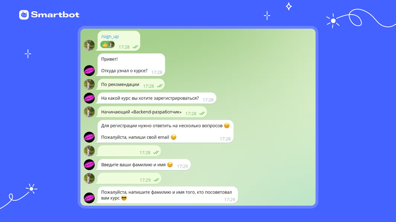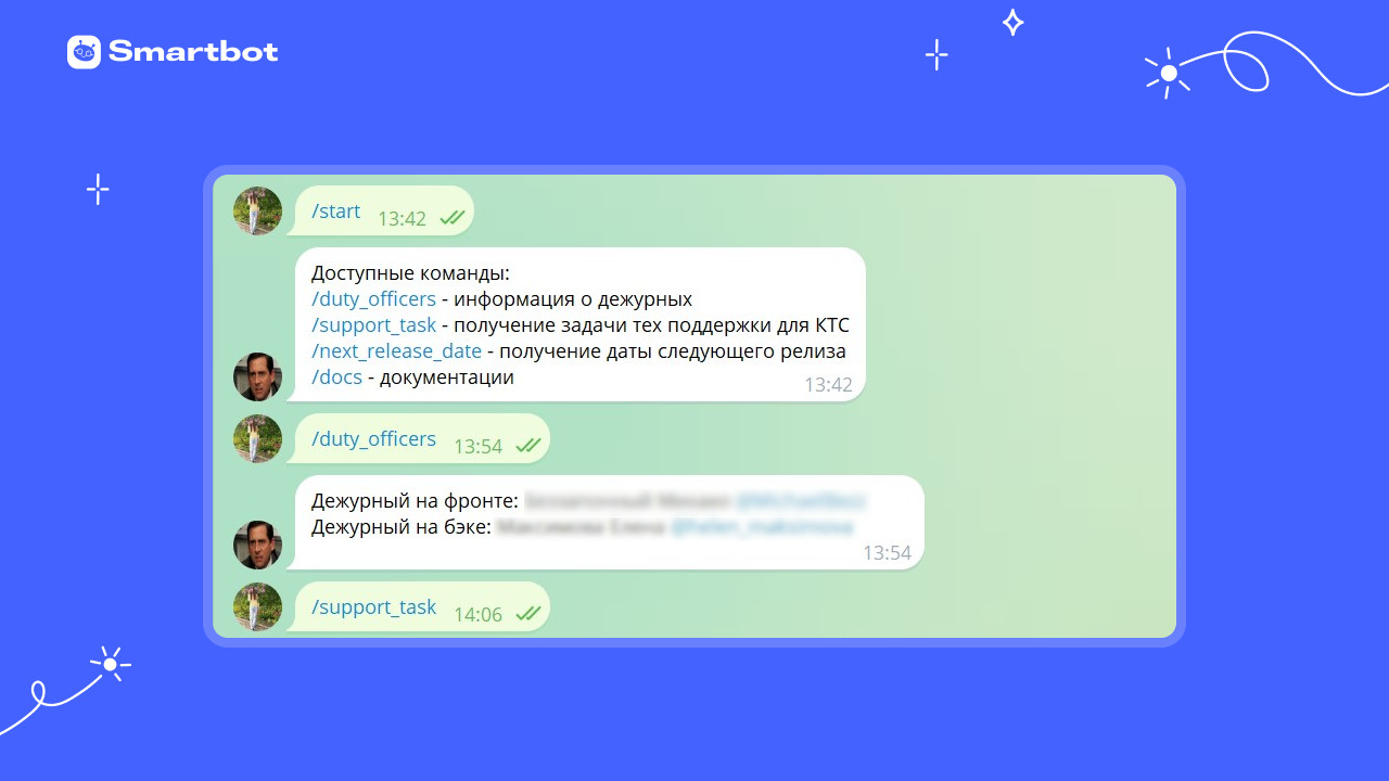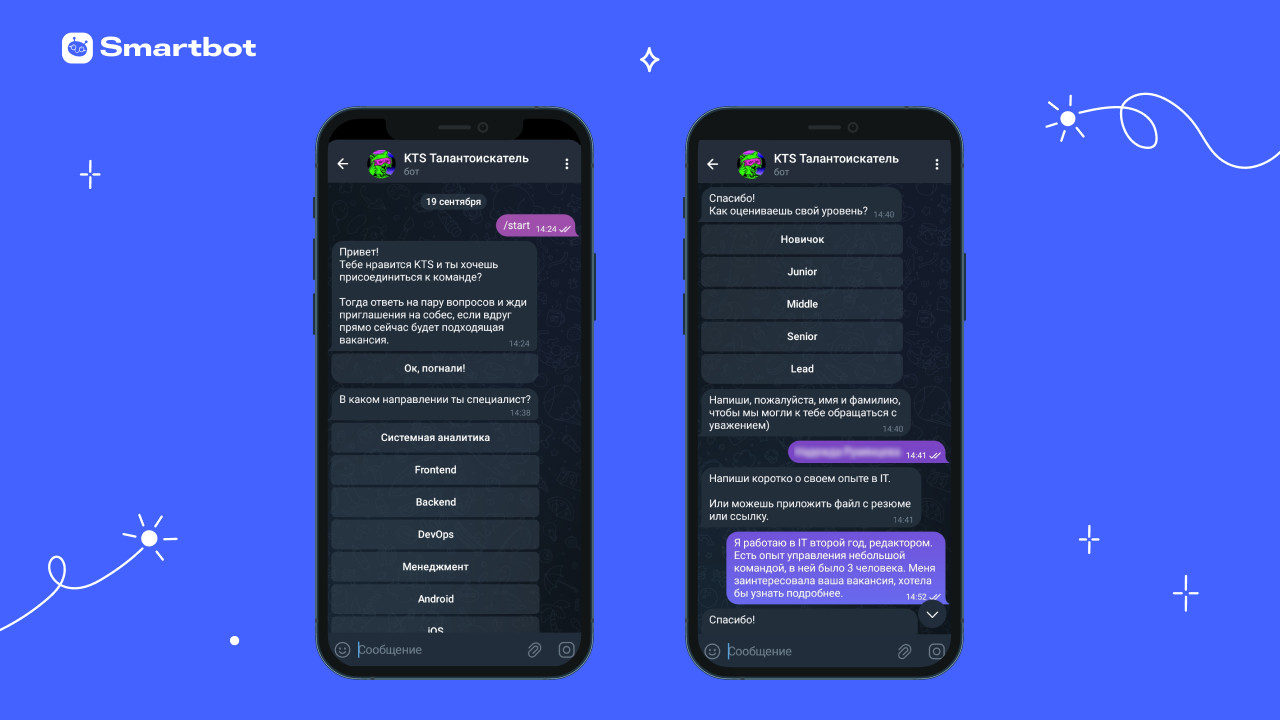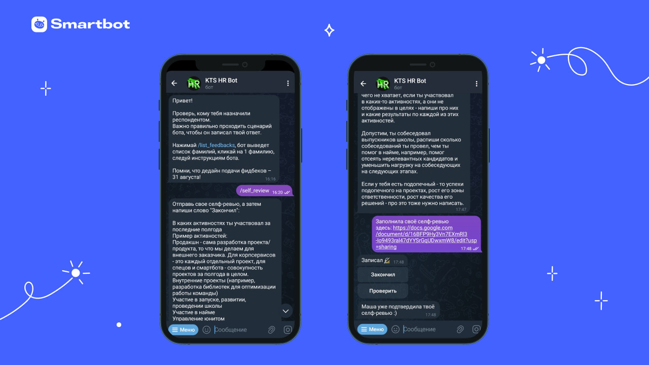 Часть этапов мы автоматизировали с помощью чат-бота. Он отправляет инструкции, собирает анкеты участников и обратную связь от коллег, напоминает о дедлайнах и заносит информацию в базы данных. Бот помогает сделать процесс ревью более системным: У KTS есть бесплатная онлайн-школа — Metaclass. В ней начинающих специалистов учат фронтенд- и бэкенд-разработке. Набор проходит раз в полгода, часть выпускников школы приглашают на стажировку в KTS. На каждый курс регистрируются 600-700 человек, из них 40-50 учеников приходят по рекомендации от сотрудников KTS или преподавателей профильных вузов. Таких студентов нужно выделить в отдельную группу, собрать их данные и отправить доступы к платформе. Чтобы администратор школы не занималась этим вручную, Metaclass используют чат-бот в Telegram. Он делит потоки на курсы и автоматизирует регистрацию учеников. В боте пользователи могут: Бот заносит данные студентов в Google-таблицы для курсов по фронтенду и бэкенду. Так Metaclass автоматически сегментируют аудиторию и экономят время администратора. Вместо 2-3 часов на регистрацию и сбор информации, она тратит 5 минут, чтобы пробежаться по таблице и проверить новые заявки. Подробнее о том, как настроили бот, мы рассказали в этом кейсе. Одна из наших команд использует чат-бот, чтобы меньше отвлекаться на переписки. Ребята работают над крупным проектом — личным кабинетом для 260 тысяч сотрудников «Пятёрочки» и других брендов X5 Group. В процессе нужно постоянно общаться со смежными командами разработчиков и менеджеров. Раньше коллеги часто задавали похожие вопросы. Например, кто дежурный, когда дата следующего релиза и где посмотреть документацию. Это было неудобно для обеих сторон: наши ребята отвлекались от задач и искали информацию, а коллеги получали ответ не сразу. Чтобы улучшить коммуникации, часто задаваемые вопросы передали боту. Для чат-бота составили график дежурств и релизов в Google-таблице, что позволило систематизировать информацию по проекту. Теперь все данные находятся в едином месте и больше не надо искать их в закреплённых сообщениях, вкладках браузера или переспрашивать у коллег. Бот добавили в рабочие чаты, и сейчас он отвечает на 100% часто задаваемых вопросов. В результате наши разработчики перестали отвлекаться, а коллеги из смежных команд получают нужную информацию за секунду. В KTS более 180 сотрудников, большинство работает удалённо. Все мы добавлены в общий чат компании: здесь сообщают новости, проводят опросы, общаются с коллегами. Чтобы сотрудники не пропускали сообщения, наш офис-менеджер использует бота-помощника. По команде он тегает сразу всех участников чата. Например, когда нужно собрать большинство коллег на онлайн-поздравление с днём рождения или пройти опрос. В среднем такие события происходят 2-3 раза в неделю. Если тегать каждого участника вручную — это займёт 1-2 часа в день. А бот отправляет 180 уведомлений за минуту. Команды KTS используют чат-боты для разных задач, но результат у всех один: сокращаются ошибки человеческого фактора, меньше времени уходит на рутину, а бизнес-процессы становятся проще и системнее. Собрать бот на конструкторе может любой сотрудник — для этого не нужны специальные навыки и знание языков программирования. Попробуйте все возможности Smartbot Pro бесплатно во время тестового периода и создайте свой первый чат-бот, чтобы а