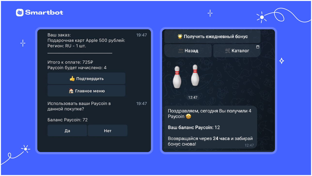 3. Проанализируйте конкурентов Найдите магазины в Telegram других компаний и оцените их функции. Пройдите путь пользователя, отметьте всё, что подходит для решения вашей задачи. Также обратите внимание на ошибки и недочёты, чтобы избежать их в чат-боте. 4. Определите состав MVP После анализа конкурентов и целевой аудитории выберите одну-две ключевые функции MVP. Они должны решать проблему пользователя. Для бота-магазина в Telegram функции будут такие: Так клиенты смогут покупать через мессенджер в любое время, а бизнес протестирует новый канал продаж с минимальными затратами. 5. Продумайте сценарий бота Создайте блок-схему с шагами пользователя и действиями чат-бота. Сделайте покупательский путь простым и удобным. Добавьте в сценарий подсказки, чтобы пользователь быстро достигал цели. Например, после выбора товаров в каталоге, бот присылает состав заказа и просит подтвердить его. Для этой задачи подойдут сервисы Miro, Figma, Unidraw и аналоги. 6. Создайте MVP Соберите чат-бот на конструкторе: загрузите каталог товаров, добавьте его в сценарий, напишите тексты сообщений и настройте уведомления менеджеру. Пошаговая инструкция, как создать магазин в Telegram, в этой статье. 7. Проведите тестирование MVP Проверьте работу бота внутри команды: пройдите сценарий и исправьте ошибки, если они есть. Предложите протестировать MVP друзьям или подписчикам в социальных сетях. Желательно, чтобы они подходили под портрет целевой аудитории. Проанализируйте обратную связь и устраните технические проблемы. Если большинство участников тестирования сбиваются на одном и том же шаге сценария, доработайте его. 8. Запустите MVP После проверки откройте доступ к продукту для реальных пользователей и начинайте набирать аудиторию. Например, расскажите о чат-боте в социальных сетях и сделайте email-рассылку по базе клиентов. Также можно запустить платную рекламу: например, через Яндекс Директ или продвижение ВКонтакте. Выбор источника зависит от вашей целевой аудитории и того, насколько она знакома с компанией и продуктом. Когда получите обратную связь от пользователей и проанализируйте показатели, доработайте MVP-версию. Что стоит сделать в первую очередь: Дальше можно внедрять в MVP новые функции. Например, в Telegram-магазин добавить программу лояльности, рассылки, игровые механики. Расскажем о трёх кейсах из нашей практики. Эти проекты изначально были MVP, а потом стали полноценными продуктами, которые приносят бизнесу желаемые результаты. Paytool: бот для продажи цифровых товаров Основатели компании хотели создать сервис, который поможет пользователям из России сохранить доступ к привычным цифровым продуктам. Чтобы быстро проверить гипотезу и спрос на товары, решили запустить чат-бот с каталогом подарочных карт для пополнения Apple ID. MVP собрали на конструкторе Smartbot Pro за два дня. В нём была одна функция: пользователь оставляет заявку, которую бот пересылает менеджеру. Сотрудник оформляет заказ и вручную отправляет код активации подарочной карты. В таком режиме поработали несколько дней и поняли, что продукт востребован. Paytool обратились в проектный офис Smartbot, чтобы доработать MVP и автоматизировать продажи. Функционал чат-бота дополнили: теперь есть личный кабинет, игровые механики, видеоинструкции и программа лояльности. В течение года Paytool расширили ассортимент и под каждую категорию т