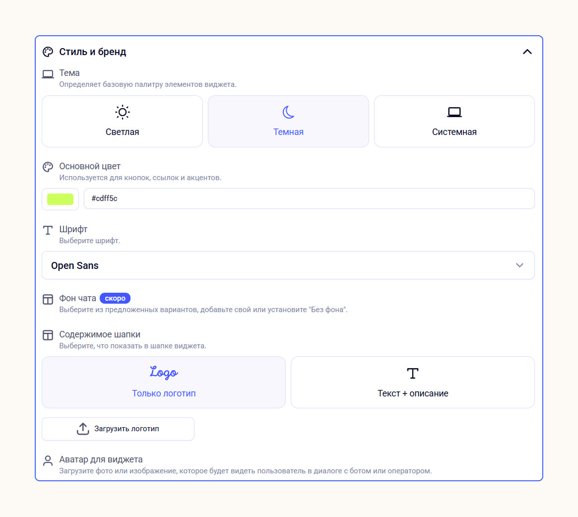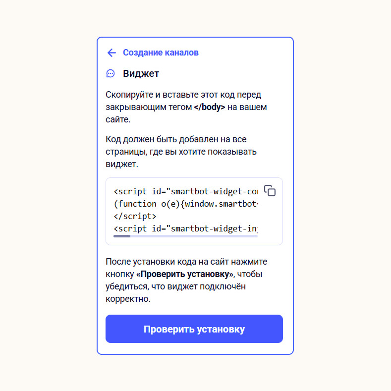 Готовое решение в Smartbot Pro позволяет подключить виджет за 10 минут. Вы можете настроить стиль основных элементов, расположение чата на сайте и взаимодействие с пользователями. Ниже — пошаговая инструкция и обзор основных возможностей. В главном меню зайдите в раздел «Каналы» и выберите «Виджет». Добавьте ссылку на сайт, скопируйте готовый скрипт и вставьте в код страницы перед закрывающим тегом