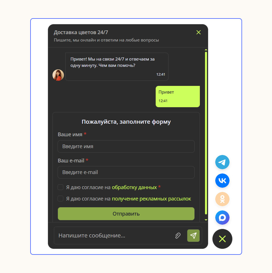 Человек хочет быстро задать вопрос и не всегда готов делиться персональными данными. Если форма регистрации появляется сразу, это создаёт барьер и увеличивает процент отказа от диалога в чате на сайте. Решение: запросить контакты позже, когда клиент уже вовлечён в общение и видит пользу от разговора. Например, для отправки персональной подборки товаров или ответа на вопрос, который требует подготовки. Новым пользователям нужно время, чтобы сориентироваться на сайте. Когда окно чата появляется в течение 5-10 секунд, это отвлекает и мешает просмотру страницы. Кроме того, виджет может перекрывать основной контент, особенно на мобильных устройствах. Решение: настроить автоматическое появление онлайн-чата в зависимости от поведения пользователя. Например, через 30-40 секунд после захода на сайт, при скролле до середины страницы или попытке закрыть вкладку. Подобрать подходящий размер окна и кнопки открытия чата. При этом иконка должна быть заметной, чтобы пользователь легко находил её. Посетителям не всегда удобно общаться в чате на сайте и оставаться на странице в ожидании ответа. Если не предоставить альтернативные способы связи, можно потерять контакт с клиентом. Решение: разместите рядом с окном чата иконки мессенджеров и добавьте в них ссылку, чтобы посетитель мог перейти в удобный канал коммуникации. Так вы покажете заботливый сервис, ненавязчиво получите контакты клиента и сможете продолжить общение в любое время. Пользователь пишет в онлайн-чат и не понимает, сколько ждать ответ. Поэтому он считает, что его игнорируют, и уходит с сайта. Решение: если вы не используете чат-ботов и отвечаете на сообщения вручную, показывайте статус операторов — онлайн или офлайн. Другой вариант — написать график работы и время ожидания в приветственном сообщении.