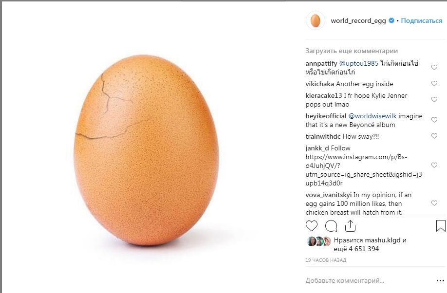 Итак, недавно мы рассказывали, что в популярной соцсети Инстаграм появился уникальный профиль с куриным яйцом без украшений и лишнего пафоса. Просто яйцо. Просто куриное. И как это ни странно, но такой минималистический подход дал потрясающие результаты. Какие именно, читайте в материале «Невероятно: простое куриное яйцо побило мировой рекорд по числу лайков в инсте». На данный момент этот снимок набрал уже почти 51 000 000 лайков и почти 3 000 000 комментариев. А вот на сам профиль world_record_egg уже подписалось почти 9 000 000 пользователей.