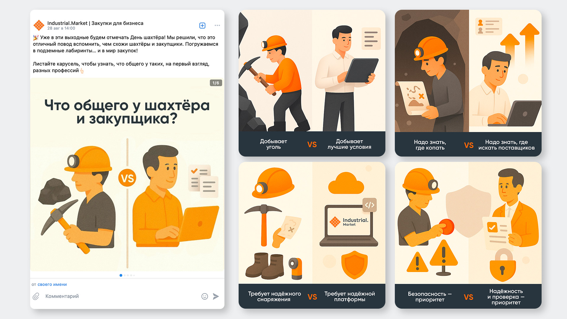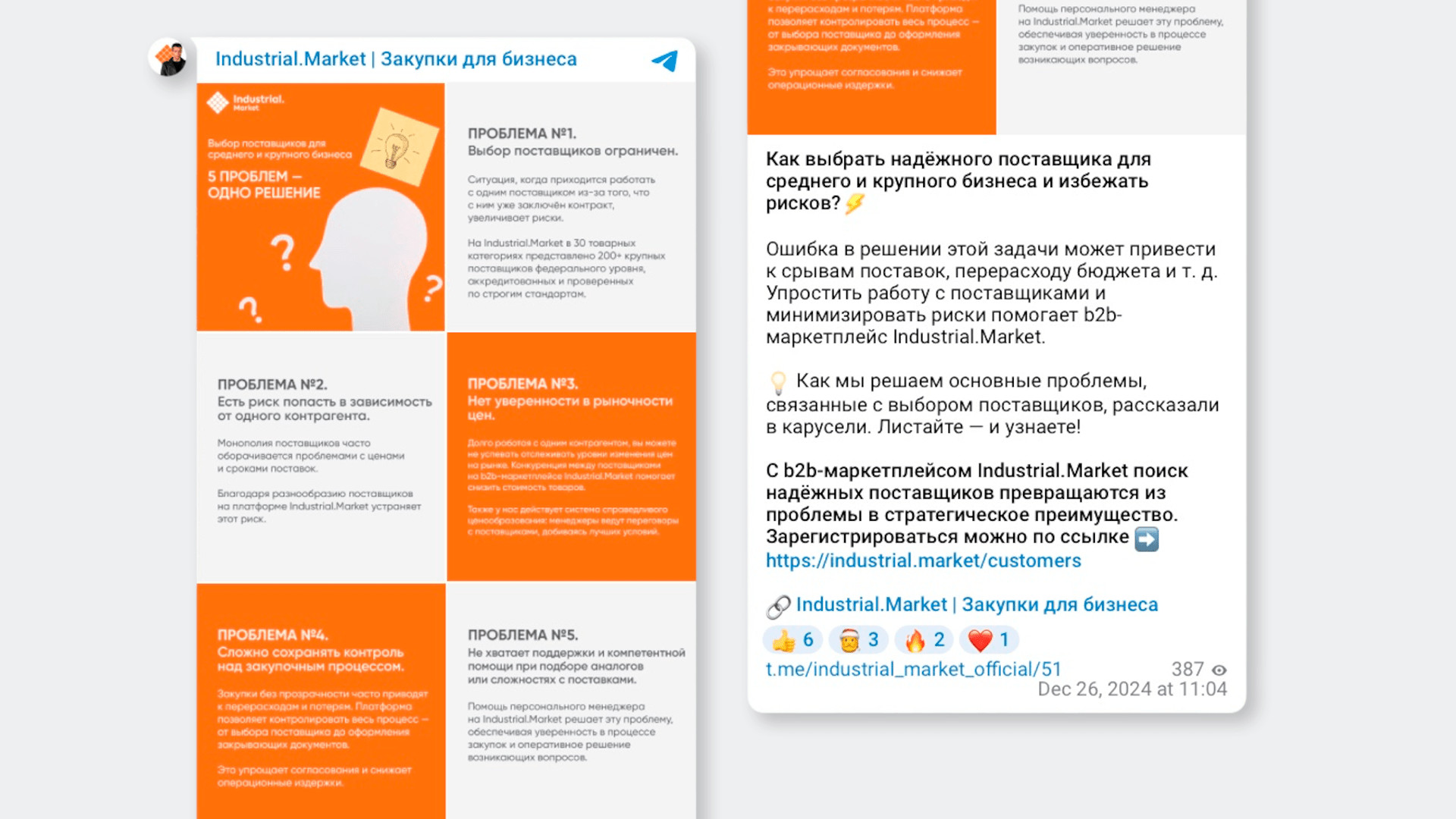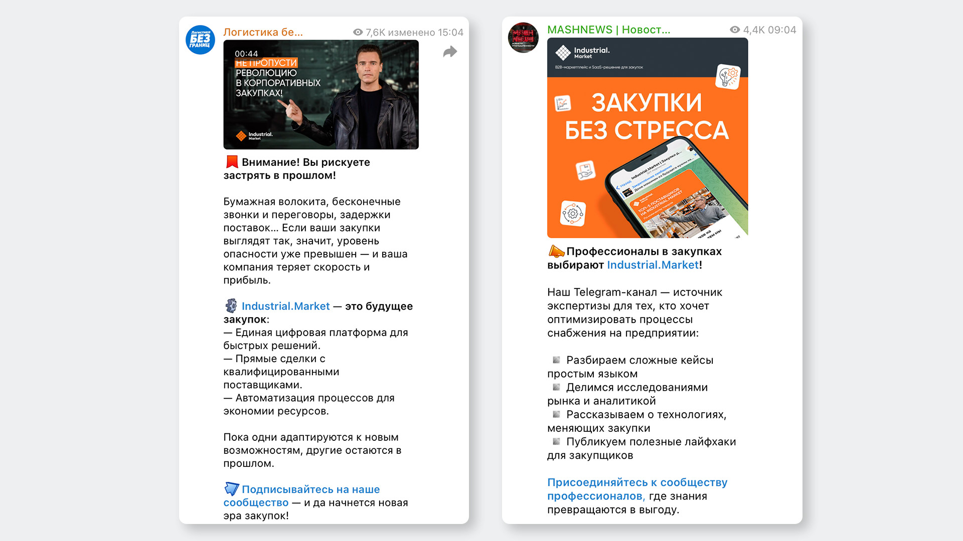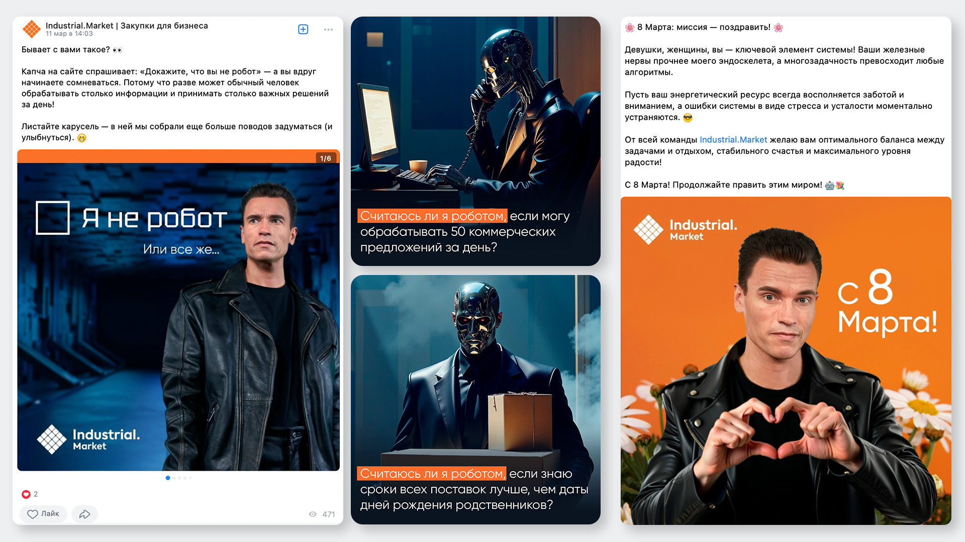 Создали структуру из рубрик: инструкции, чек-листы, разборы кейсов, интервью с закупщиками и экспертные объяснения. Всё простым и прикладным языком, без канцелярита и лишней теории. Такой подход позволил даже сложные темы превратить в доступные и практичные.Вид контент-плана и коммуникация с клиентом Визуал Сделали лаконичным, но ярким. Мы адаптировали стиль под восприятие B2B-аудитории: без перегрузки графикой, с акцентом на смысл, чтобы удерживать внимание даже тех, кто не привык читать контент в соцсетях. Продвижение Выбрали ключевые площадки (ВКонтакте, Telegram и Дзен), зафиксировали KPI и выстроили единую систему, в которой контент, таргет и посевы работают вместе. Это позволило системно привлекать, удерживать и вовлекать нужную аудиторию. В нише, где почти нет простого и системного контента для закупщиков, мы стали теми, кто начал говорить с аудиторией на её языке. Благодаря этому у нас получилось стать понятным навигатором в теме закупок через маркетплейсы. Что делали: Чтобы привлечь аудиторию, мы использовали комбинацию таргетированной рекламы и инфлюенс-маркетинга: Таргетированная реклама во ВКонтакте Запускали рекламу на ключевую аудиторию: закупщиков, директоров по закупкам и специалистов из промсектора. Пробовали разные гипотезы и креативы: как полезный контент, так и контент, который бьёт в боли ЦА. Постепенно находили связки, которые действительно работают, и шаг за шагом снижали стоимость клика и подписчика. Благодаря этому в канал приходят не случайные люди, а те, кому действительно был интересен наш контент и формат. Инфлюенс-маркетинг В Telegram привлекали аудиторию с помощью посевов. В процессе работы столкнулись с трудностями: подходящих Telegram-каналов с нужной аудиторией очень мало. Но даже в этих условиях мы нашли релевантные площадки, провели тестовые размещения и начали получать первые просмотры, переходы и обсуждения. Так начало формироваться ядро аудитории канала. Нам было важно привлечь только целевых подписчиков. Поэтому посты для посевов составлялись таким образом, чтобы зацепить внимание аудитории и замотивировать её перейти в наш Telegram-канал профессионалов в сфере закупок. После тестов для посевов были выбраны следующие тематики каналов: напрямую связанные с закупками, бизнес и экономика, промышленность, логистика. Наиболее эффективно сработали посты в каналах о закупках и промышленности. Суммарно за 5 месяцев они позволили привлечь +275 подписчиков в канал со сложной узкопрофильной темой. С помощью рекламы мы привлекали целевую аудиторию в аккаунт Industrial.Market, а дальше системно прогревали ее через экспертный контент. В итоге посевы, таргет и контент работали как единое целое. Особой фишкой проекта стали публикации со сгенерированным аватаром Терминатора. Сам аватар был разработан на стороне клиента. Industrial.Market предоставили его нам, а мы внедрили его в наши публикации и рекламную кампанию. Цель привлечения такого аватара — повысить узнаваемость B2B-маркетплейса среди целевой аудитории — закупщиков и снабженцев, а также привлечь новых подписчиков в сообщество. Основная идея: Терминатор — символ технологического превосходства. Для проекта это не совсем герой, а скорее представитель из будущего, который знает, что ждет человечество впереди. Он вернулся в наше время, чтобы сказать: «Ребята, Industrial.Market 
