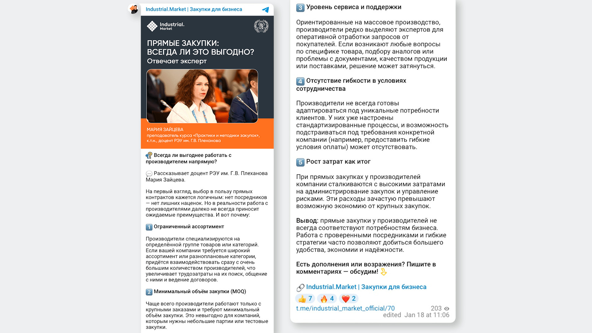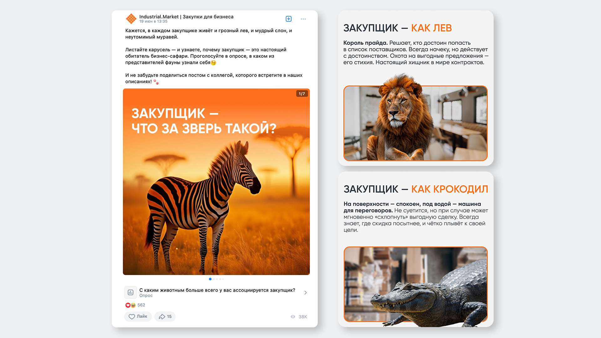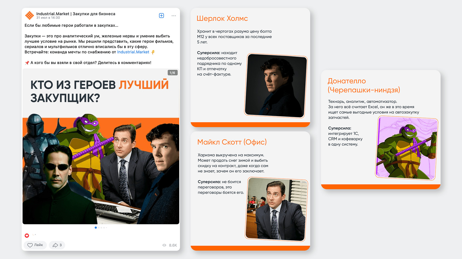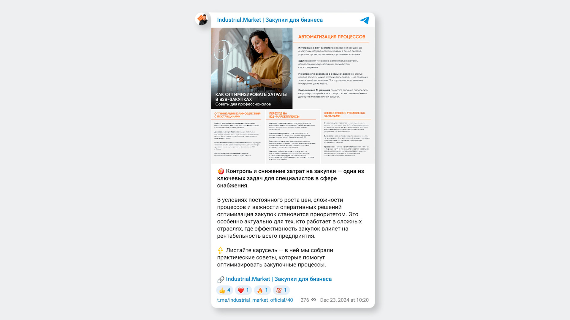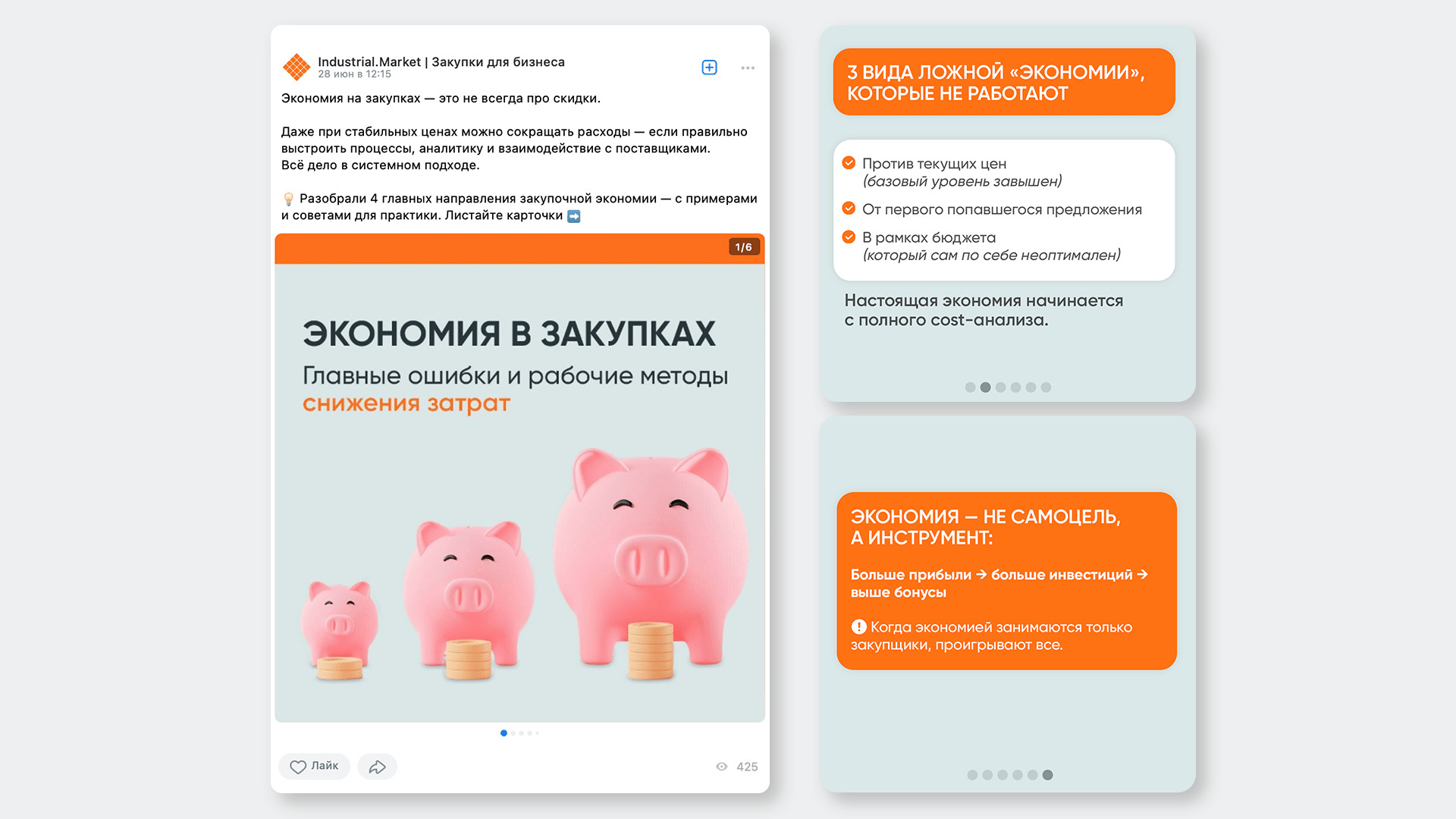 Создали структуру из рубрик: инструкции, чек-листы, разборы кейсов, интервью с закупщиками и экспертные объяснения. Всё простым и прикладным языком, без канцелярита и лишней теории. Такой подход позволил даже сложные темы превратить в доступные и практичные.Вид контент-плана и коммуникация с клиентом Визуал Сделали лаконичным, но ярким. Мы адаптировали стиль под восприятие B2B-аудитории: без перегрузки графикой, с акцентом на смысл, чтобы удерживать внимание даже тех, кто не привык читать контент в соцсетях. Продвижение Выбрали ключевые площадки (ВКонтакте, Telegram и Дзен), зафиксировали KPI и выстроили единую систему, в которой контент, таргет и посевы работают вместе. Это позволило системно привлекать, удерживать и вовлекать нужную аудиторию. В нише, где почти нет простого и системного контента для закупщиков, мы стали теми, кто начал говорить с аудиторией на её языке. Благодаря этому у нас получилось стать понятным навигатором в теме закупок через маркетплейсы. Что делали: Чтобы привлечь аудиторию, мы использовали комбинацию таргетированной рекламы и инфлюенс-маркетинга: Таргетированная реклама во ВКонтакте Запускали рекламу на ключевую аудиторию: закупщиков, директоров по закупкам и специалистов из промсектора. Пробовали разные гипотезы и креативы: как полезный контент, так и контент, который бьёт в боли ЦА. Постепенно находили связки, которые действительно работают, и шаг за шагом снижали стоимость клика и подписчика. Благодаря этому в канал приходят не случайные люди, а те, кому действительно был интересен наш контент и формат. Инфлюенс-маркетинг В Telegram привлекали аудиторию с помощью посевов. В процессе работы столкнулись с трудностями: подходящих Telegram-каналов с нужной аудиторией очень мало. Но даже в этих условиях мы нашли релевантные площадки, провели тестовые размещения и начали получать первые просмотры, переходы и обсуждения. Так начало формироваться ядро аудитории канала. Нам было важно привлечь только целевых подписчиков. Поэтому посты для посевов составлялись таким образом, чтобы зацепить внимание аудитории и замотивировать её перейти в наш Telegram-канал профессионалов в сфере закупок. После тестов для посевов были выбраны следующие тематики каналов: напрямую связанные с закупками, бизнес и экономика, промышленность, логистика. Наиболее эффективно сработали посты в каналах о закупках и промышленности. Суммарно за 5 месяцев они позволили привлечь +275 подписчиков в канал со сложной узкопрофильной темой. С помощью рекламы мы привлекали целевую аудиторию в аккаунт Industrial.Market, а дальше системно прогревали ее через экспертный контент. В итоге посевы, таргет и контент работали как единое целое. Особой фишкой проекта стали публикации со сгенерированным аватаром Терминатора. Сам аватар был разработан на стороне клиента. Industrial.Market предоставили его нам, а мы внедрили его в наши публикации и рекламную кампанию. Цель привлечения такого аватара — повысить узнаваемость B2B-маркетплейса среди целевой аудитории — закупщиков и снабженцев, а также привлечь новых подписчиков в сообщество. Основная идея: Терминатор — символ технологического превосходства. Для проекта это не совсем герой, а скорее представитель из будущего, который знает, что ждет человечество впереди. Он вернулся в наше время, чтобы сказать: «Ребята, Industrial.Market 