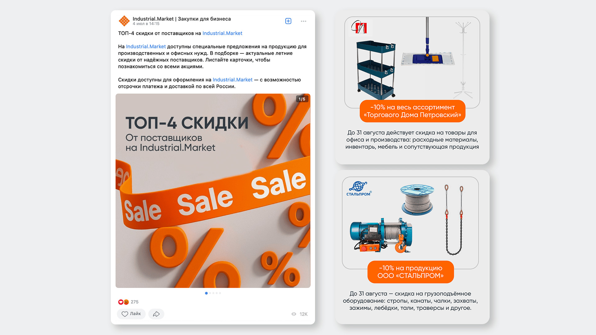 Industrial.Market — B2B-маркетплейс, который упрощает процесс закупок для среднего и крупного бизнеса. На площадке можно найти различные товары: от канцелярии до инструментов и оборудования.