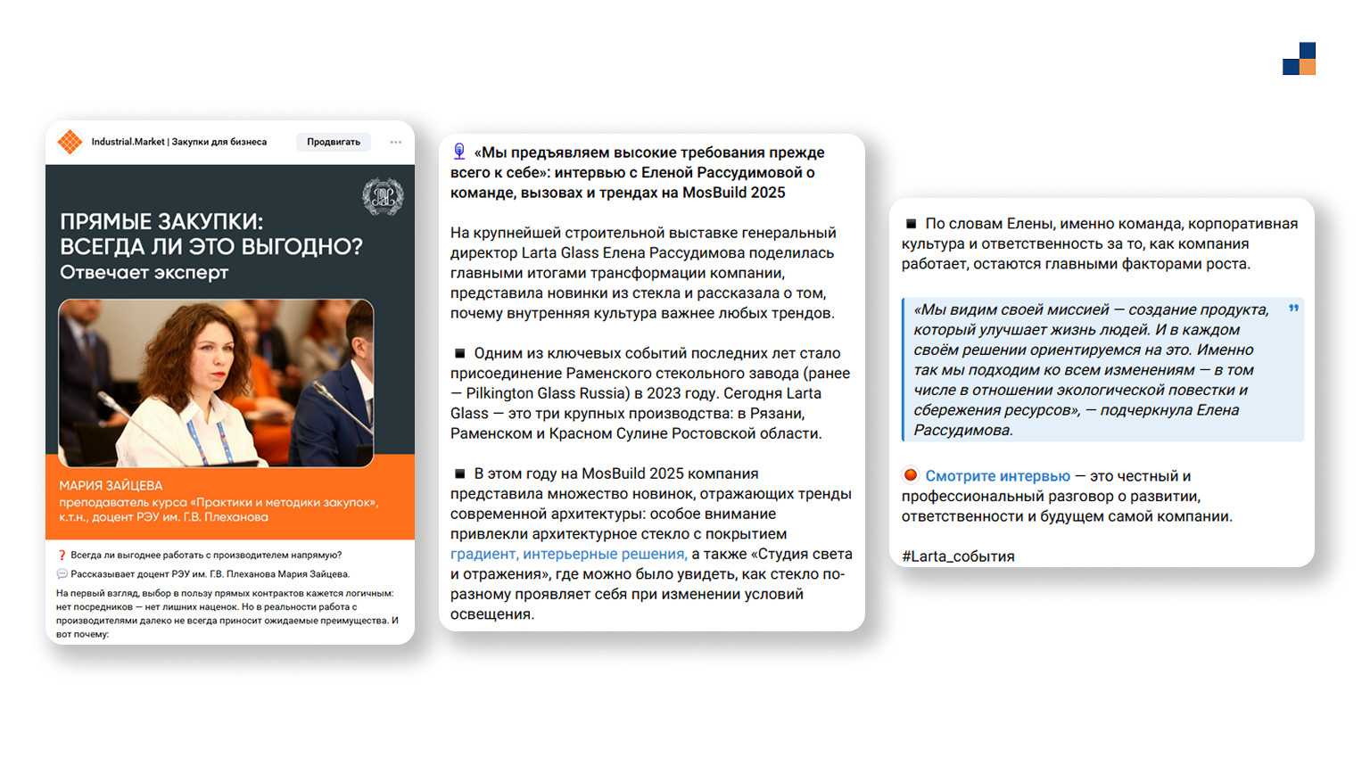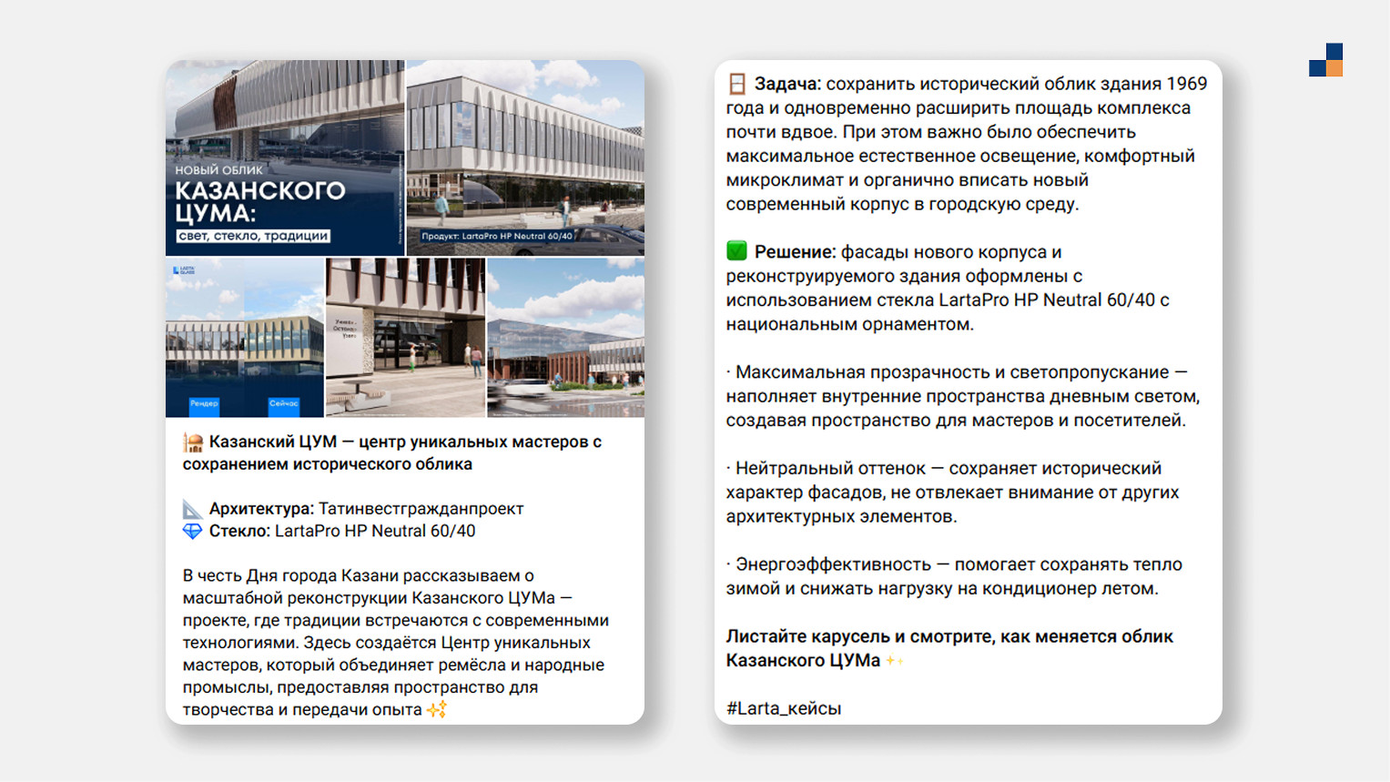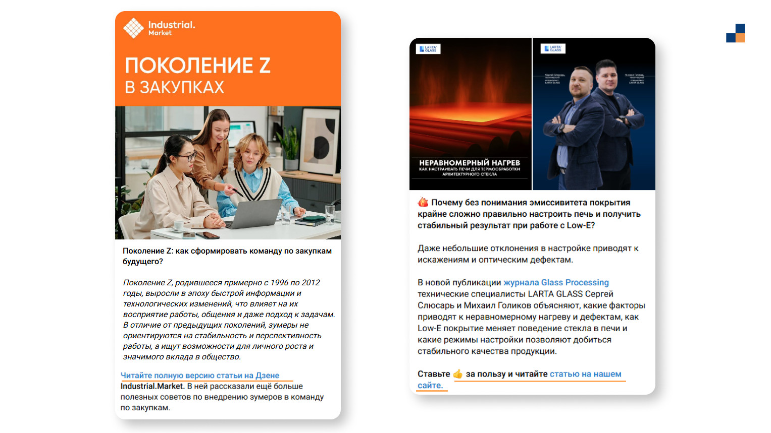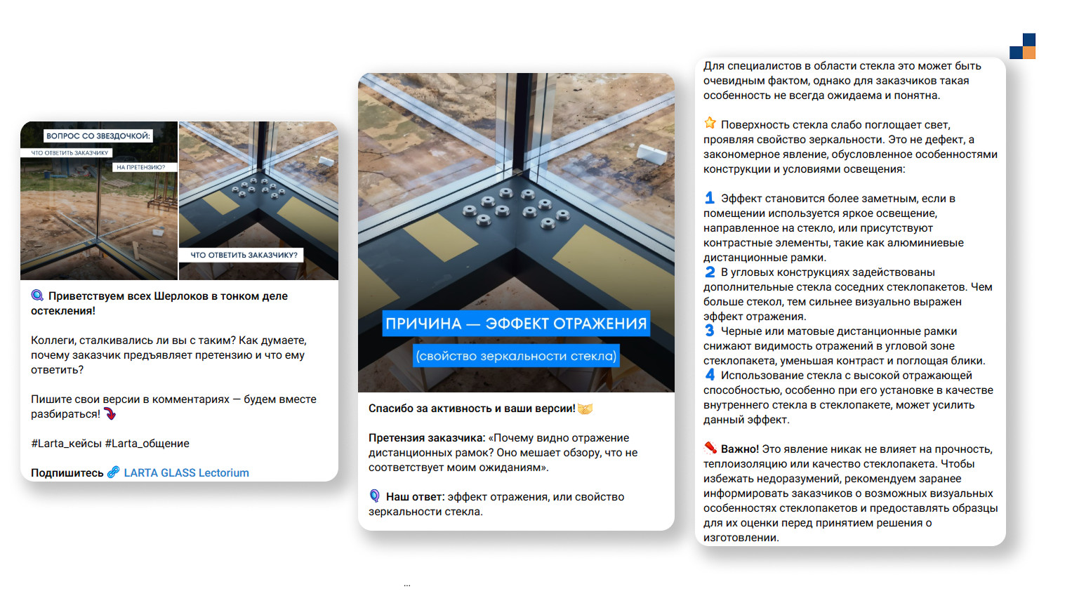 Чтобы сохранить глубину и не отнимать у клиента лишнего времени, мы выстроили систему взаимодействия со специалистами. Перевод сложных тем в ясный и точный контент — та задача, которую бизнес поручает нам. Мы выстраиваем процессы так, чтобы бюджеты на SMM устраивали обе стороны. Подробнее о наших подходах — в статье «Как мы экономим до 30% SMM‑бюджета клиентам — и не теряем в результатах». За примерами, которые вы увидите, стоит совместная работа — идеи, знания и опыт. Такой подход показывает, как сотрудничество нашего агентства и команды клиента, например, экспертов LARTA GLASS и LARTA GLASS Lectorium, превращается в сильный результат. Даже самый полезный и технологичный продукт выглядит в соцсетях скучно, если рассказывать о нем языком инструкций и характеристик. Для неподготовленного читателя такие тексты превращаются в «стену» без эмоционального входа и не оставляют повода задержаться. Задача контента — объяснить, как продукт решает проблему клиента и почему именно на него стоит обратить внимание. Вот как мы сокращаем путь от «не понимаю» до «хочу разобраться»: Когда контент объясняет, зачем это нужно клиенту, он помогает читателю быстро соотнести продукт со своей задачей и запомнить решение. И тем самым работает на бизнес. Формальные посты вроде «Запущен новый раздел каталога» или «Обзор стандартов ISO» редко вызывают отклик или обсуждение. Читатель видит в них сухое сообщение без контекста и ценности и остается без ответа — «и что с этого?». Мы показываем новости через реальные задачи клиентов и истории людей — чтобы каждая публикация отвечала на вопрос «Что это значит для меня?». Показывая ход решения, такой контент закрепляет за брендом роль эксперта. Читатель видит, что компания помогает разобраться, а не просто продает. Текст сам по себе не позволяет «увидеть пользу». Без схемы или короткого видео сложные технологии остаются абстракцией — трудно представить, где они применяются и какой дают результат. В B2B-коммуникациях визуальный контент делает пользу продукта наглядной и ощутимой и сокращает путь от понимания к доверию. Поэтому мы: Визуальный контент показывает ценность продукта напрямую, вызывает доверие и сокращает путь от первого интереса до диалога. Когда пытаются объяснить весь процесс за один раз, внимание теряется: информации слишком много, читатель не успевает уловить суть и не делает следующий шаг. В B2B контент должен вести от любопытства к осознанному интересу. Мы разбиваем рассказ на шаги — так клиенту проще следить за логикой: Такие приемы помогают сопровождать клиента по пути от информации к действию — и тем самым повышают вероятность диалога с брендом. Современные форматы в B2B-коммуникациях помогают клиенту быстро «схватить» смысл продукта, довериться источнику и захотеть узнать больше. Если бренд игнорирует тренды, считая их «несерьезными», контент выглядит чуждо и устарело и не дает клиенту «услышать» компанию. В B2B это означает потерю внимания и доверия. Мы подбираем и адаптируем тренды для B2B-контента, чтобы донести смысл продукта в формате, привычном и понятном аудитории. Говоря с аудиторией на ее языке, такой контент удерживает внимание, вызывает доверие и делает экспертный бренд ближе к ЦА. Даже самые технические продукты можно показать так, чтобы они вызывали интерес, а не растерянность. Когда конте