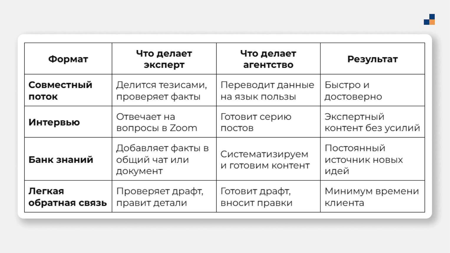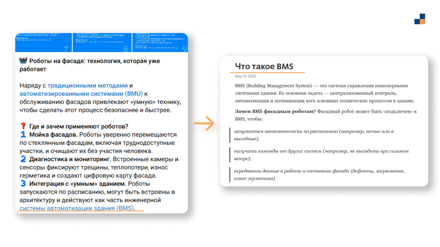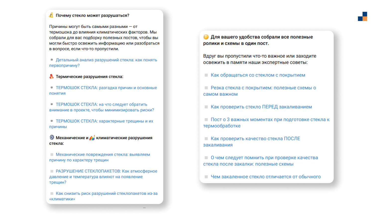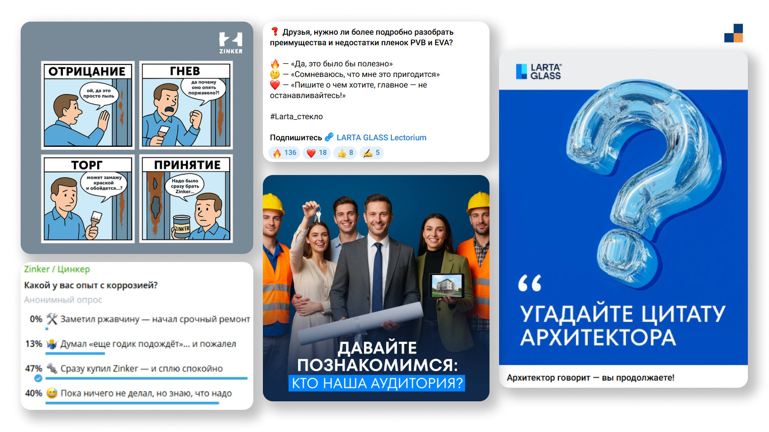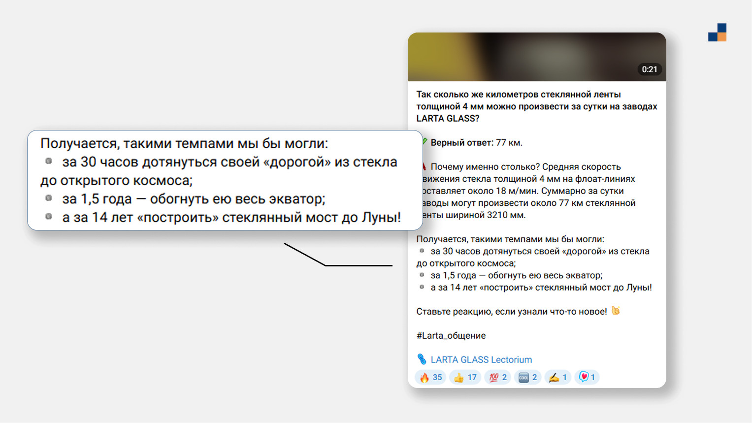 Чтобы сохранить глубину и не отнимать у клиента лишнего времени, мы выстроили систему взаимодействия со специалистами. Перевод сложных тем в ясный и точный контент — та задача, которую бизнес поручает нам. Мы выстраиваем процессы так, чтобы бюджеты на SMM устраивали обе стороны. Подробнее о наших подходах — в статье «Как мы экономим до 30% SMM‑бюджета клиентам — и не теряем в результатах». За примерами, которые вы увидите, стоит совместная работа — идеи, знания и опыт. Такой подход показывает, как сотрудничество нашего агентства и команды клиента, например, экспертов LARTA GLASS и LARTA GLASS Lectorium, превращается в сильный результат. Даже самый полезный и технологичный продукт выглядит в соцсетях скучно, если рассказывать о нем языком инструкций и характеристик. Для неподготовленного читателя такие тексты превращаются в «стену» без эмоционального входа и не оставляют повода задержаться. Задача контента — объяснить, как продукт решает проблему клиента и почему именно на него стоит обратить внимание. Вот как мы сокращаем путь от «не понимаю» до «хочу разобраться»: Когда контент объясняет, зачем это нужно клиенту, он помогает читателю быстро соотнести продукт со своей задачей и запомнить решение. И тем самым работает на бизнес. Формальные посты вроде «Запущен новый раздел каталога» или «Обзор стандартов ISO» редко вызывают отклик или обсуждение. Читатель видит в них сухое сообщение без контекста и ценности и остается без ответа — «и что с этого?». Мы показываем новости через реальные задачи клиентов и истории людей — чтобы каждая публикация отвечала на вопрос «Что это значит для меня?». Показывая ход решения, такой контент закрепляет за брендом роль эксперта. Читатель видит, что компания помогает разобраться, а не просто продает. Текст сам по себе не позволяет «увидеть пользу». Без схемы или короткого видео сложные технологии остаются абстракцией — трудно представить, где они применяются и какой дают результат. В B2B-коммуникациях визуальный контент делает пользу продукта наглядной и ощутимой и сокращает путь от понимания к доверию. Поэтому мы: Визуальный контент показывает ценность продукта напрямую, вызывает доверие и сокращает путь от первого интереса до диалога. Когда пытаются объяснить весь процесс за один раз, внимание теряется: информации слишком много, читатель не успевает уловить суть и не делает следующий шаг. В B2B контент должен вести от любопытства к осознанному интересу. Мы разбиваем рассказ на шаги — так клиенту проще следить за логикой: Такие приемы помогают сопровождать клиента по пути от информации к действию — и тем самым повышают вероятность диалога с брендом. Современные форматы в B2B-коммуникациях помогают клиенту быстро «схватить» смысл продукта, довериться источнику и захотеть узнать больше. Если бренд игнорирует тренды, считая их «несерьезными», контент выглядит чуждо и устарело и не дает клиенту «услышать» компанию. В B2B это означает потерю внимания и доверия. Мы подбираем и адаптируем тренды для B2B-контента, чтобы донести смысл продукта в формате, привычном и понятном аудитории. Говоря с аудиторией на ее языке, такой контент удерживает внимание, вызывает доверие и делает экспертный бренд ближе к ЦА. Даже самые технические продукты можно показать так, чтобы они вызывали интерес, а не растерянность. Когда конте