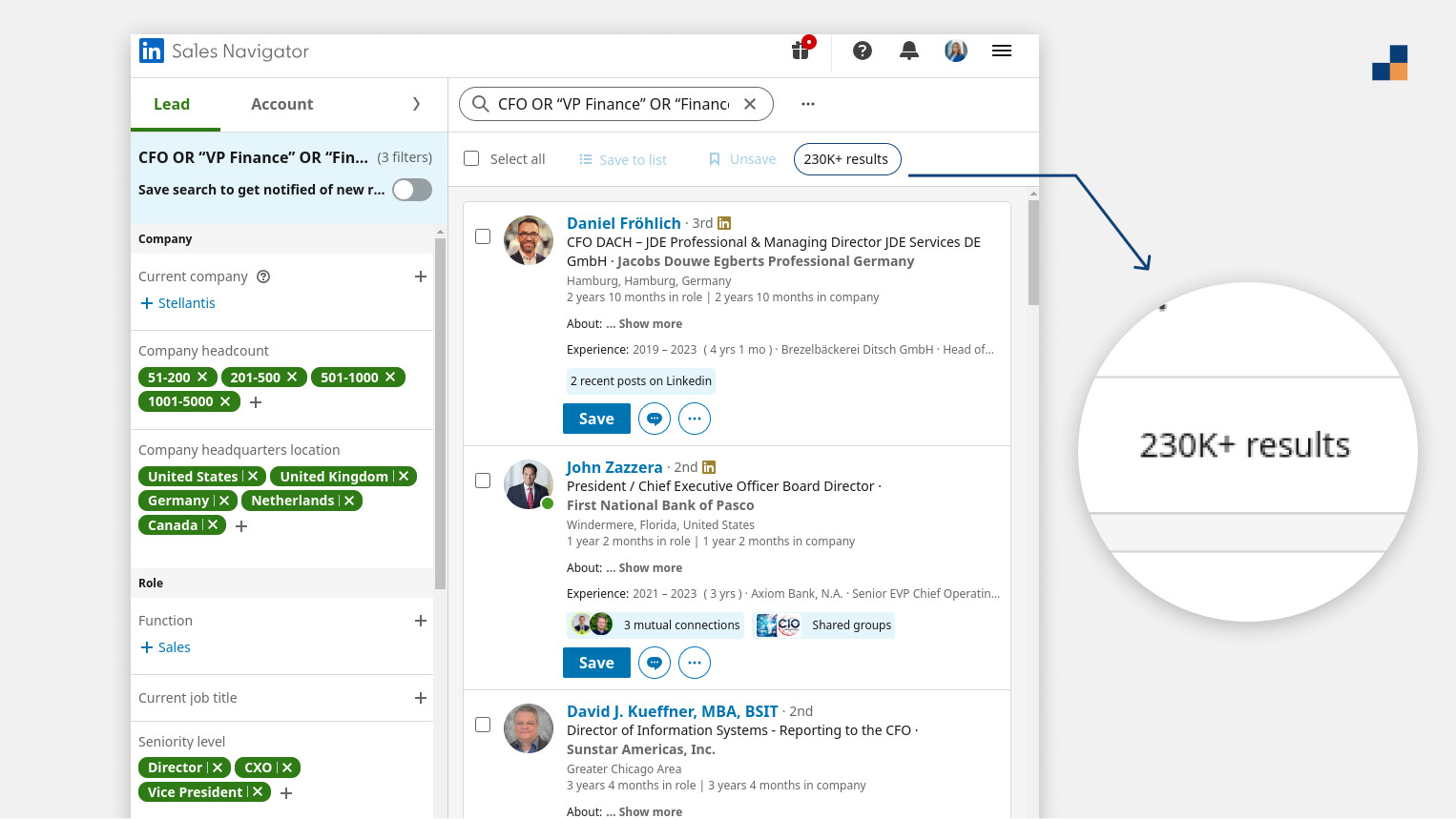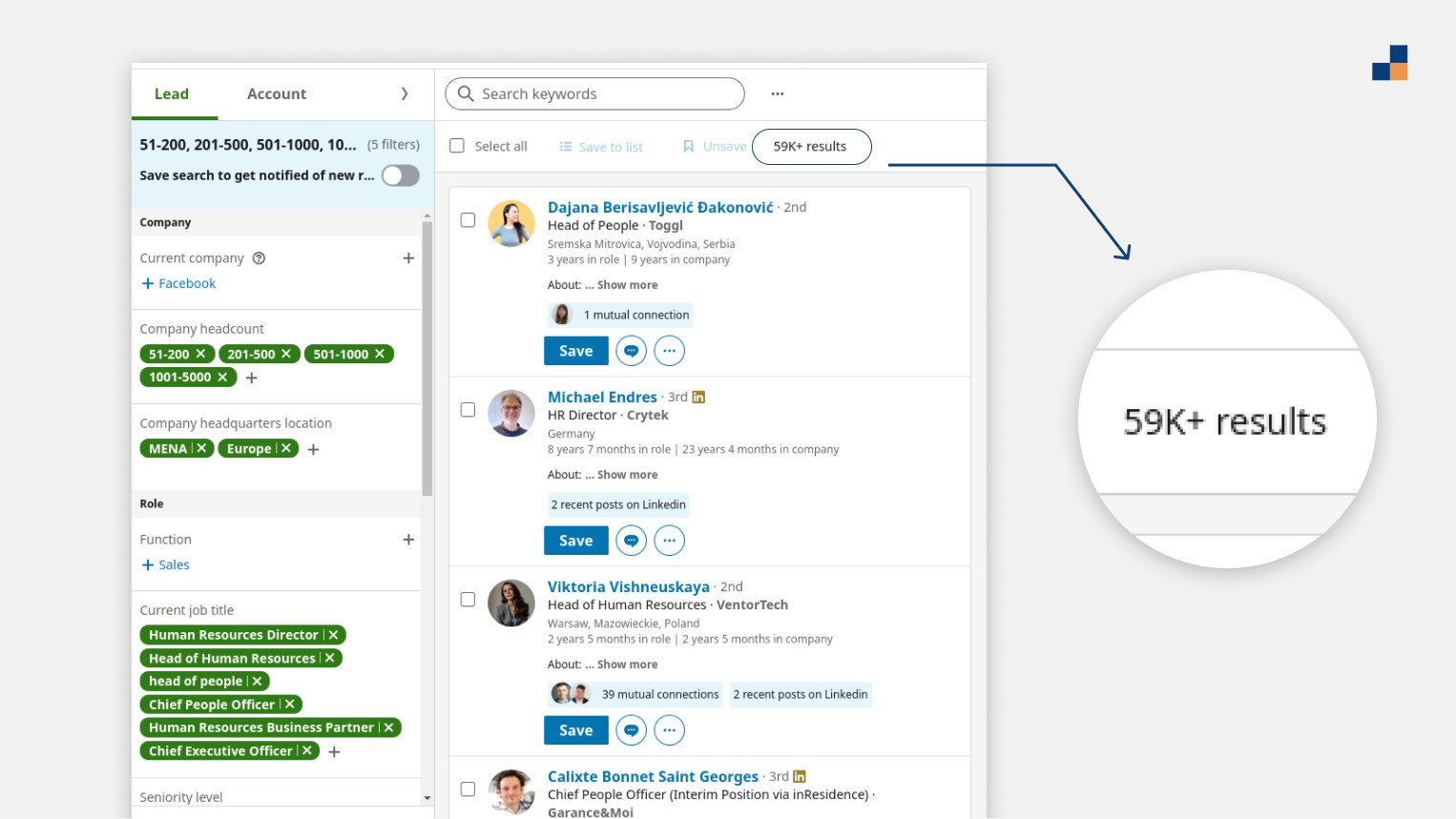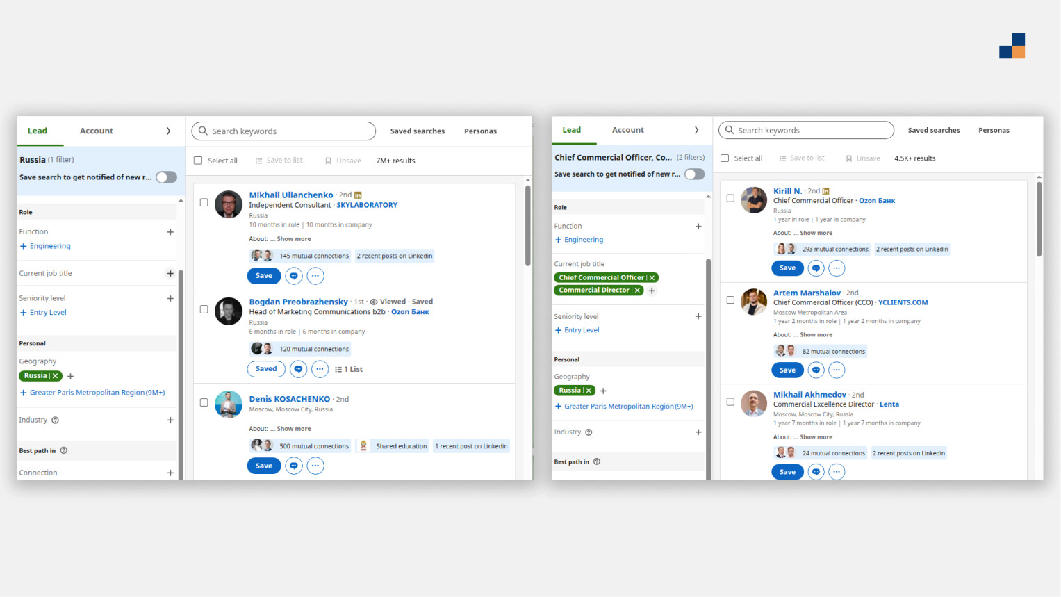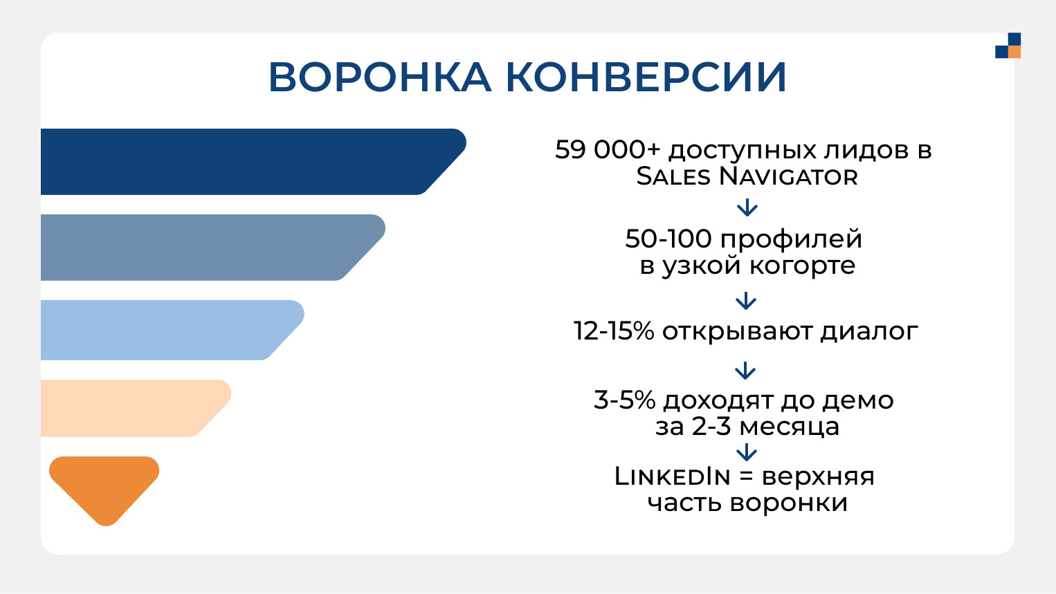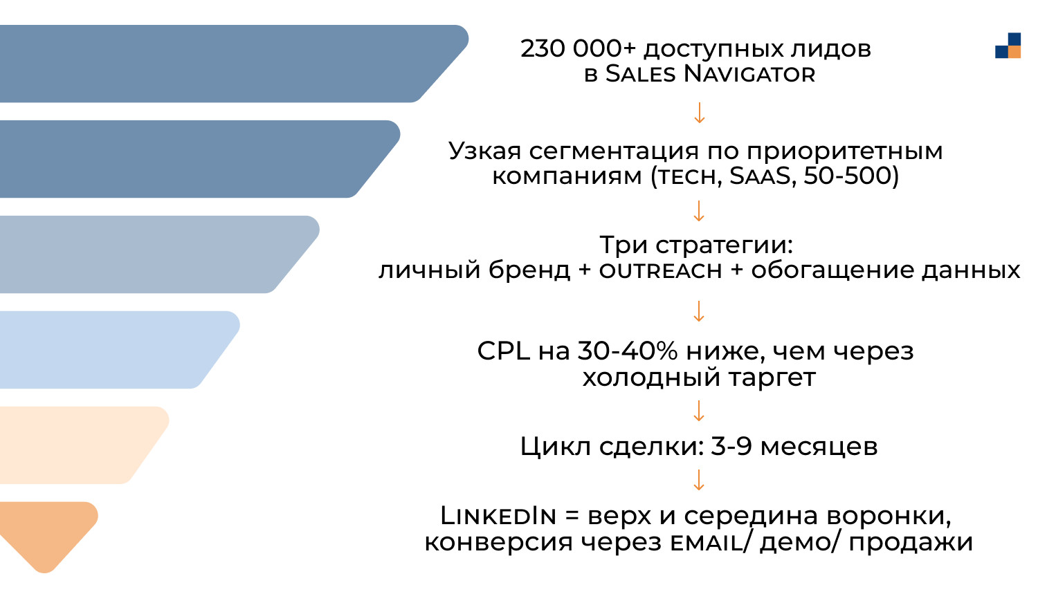 В итоге у CMO и руководителей маркетинга формируется искажение: LinkedIn — это «не для бизнеса», «не для продаж», «не для российского рынка». Это искажение усиливается тем, что в русскоязычном поле почти нет материалов, ориентированных на управленцев, которые показывают связку LinkedIn с воронкой, CRM и перформансом. В 2026 году эта картина меняется. LinkedIn перестает быть «слепой зоной» для маркетинга и все чаще используется как инструмент выстраивания доверия и деловых отношений. В этой статье мы разберем: Сразу договоримся о главном: LinkedIn — это не универсальный канал и точно не «волшебная таблетка» для лидогенерации. Он работает только при определенных условиях — когда бизнес готов вкладываться в контент, диалог и долгую работу с доверием. Здесь важно смотреть не на платформу, а на тип бизнеса и логику продаж. LinkedIn работает не «для всех B2B», а для определенных бизнес-моделей. LinkedIn работает для B2B, если: Ценность LinkedIn в том, что он позволяет найти людей, принимающих решение именно по вашему продукту, и выстроить с ними коммуникацию в профессиональном контексте — с учетом их роли, отрасли и стадии бизнеса. LinkedIn НЕ работает, если: Если ваш продукт продается без экспертности и доверия — вам нужны другие каналы. LinkedIn требует времени и вовлечения людей. Ключевой вопрос для CMO: не «нужен ли нам LinkedIn», а «готовы ли мы инвестировать в долгую игру». Если ответ «да» — дальше разберем, как именно LinkedIn работает в B2B и какие стратегии дают результат в 2026 году. Если «нет» — лучше честно признать это сейчас, чем через полгода разочароваться в канале, который изначально не подходил под вашу модель продаж. Компания продает сложный B2B-продукт для внутренних коммуникаций и HR-процессов: корпоративный мессенджер, базу знаний, профили сотрудников, аналитику, HR-модули и AI-ассистента. Цикл сделки длинный, решение принимается не импульсно и почти всегда требует вовлечения нескольких ролей. Ключевая аудитория (ICP) в LinkedIn: Тип компаний: Как выглядит аудитория в LinkedIn: по данным LinkedIn Sales Navigator, при фильтрации по ролям, географии и размеру компаний доступна выборка 59 000+ потенциальных лидов. Это реальные профили HR-директоров и топ-менеджеров, с которыми можно выстраивать коммуникацию. Что можно сделать с этой аудиторией: вместо работы со всей базой сразу сформировать узкие когорты по 50-100 профилей с учетом: Дальше — применить комбинацию двух стратегий: Прогнозируемый результат: Для такого продукта LinkedIn может стать оптимальным каналом, потому что позволяет выходить напрямую на ЛПР, выстраивать доверие и работать с длинным циклом сделки, где решение принимается на основе экспертизы и контекста, а не "быстрого клика. Компания разрабатывает SaaS-решение для автоматизации финансовых потоков, бюджетирования, прогнозирования и отчетности в средних и крупных компаниях. Продажи сложные, требуют вовлечения финансовых руководителей и нескольких этапов согласования. Ключевые роли (ICP) в LinkedIn: География: Как выглядит аудитория в LinkedIn: по данным LinkedIn Sales Navigator, при фильтрации по ролям, seniority и географии доступна выборка 230 000+ потенциальных лидов — финансовых директоров и топ-менеджеров целевых компаний. Как можно работать с этой аудиторией: LinkedIn можно использовать в связке трех стратегий: 1. Личный бренд CFO и CEO компании: Цель — позиционирование как экспертов, которые понимают боли CFO изнутри
