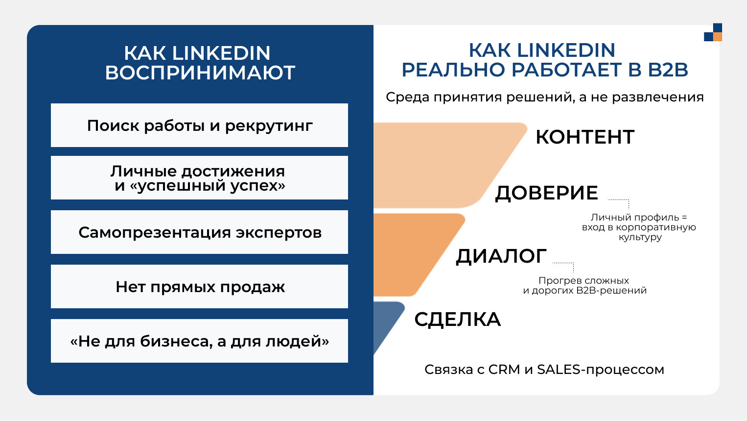 Поэтому ключевая формула LinkedIn в B2B: продает не бренд, а человек, которому доверяют — от имени бренда.