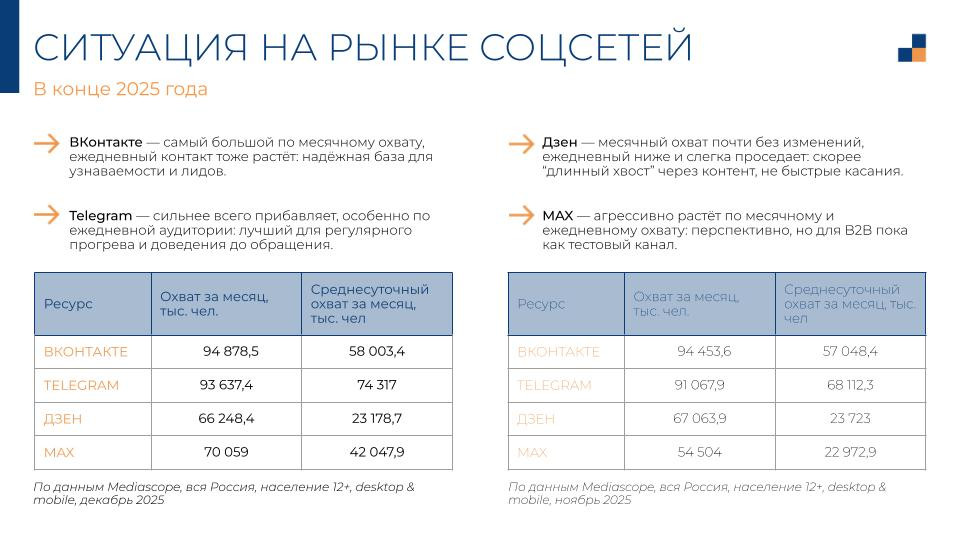ВКонтакте и Telegram сопоставимы по месячному охвату — около 94 млн человек у каждого. Но у Telegram суточный охват выше: 74 млн против 58 млн у ВКонтакте. Люди заходят туда каждый день, а не раз в неделю. Для B2B это принципиально: прогрев работает через регулярный контакт, а разовые касания его не заменяют.