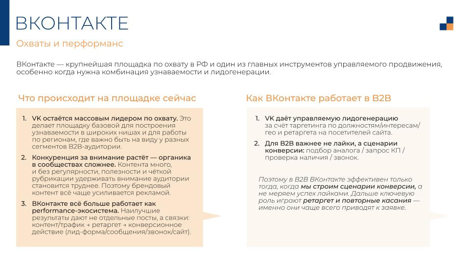 ВКонтакте — про управляемую лидогенерацию. Таргет по должностям, ретаргет на посетителей сайта, цепочка контент — трафик — конверсия. Органика без рекламной поддержки давно не работает. Это просто факт, с которым нет смысла спорить.
