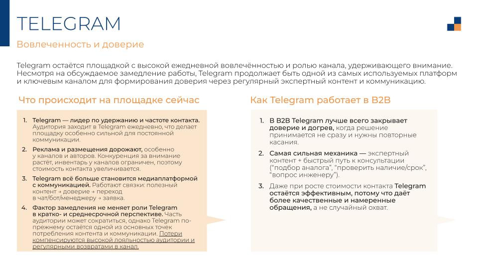 Ситуация с Telegram хорошо это демонстрирует: зависимость от одного канала — операционный риск. Алгоритм, регулятор, стоимость контакта — что-то изменится. Система из нескольких площадок этот риск снижает.