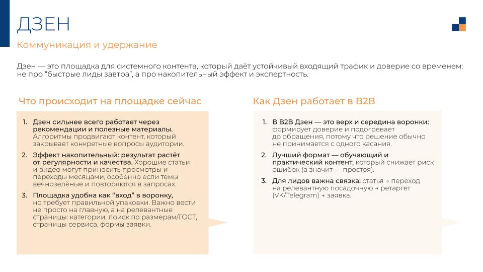 Для B2B это верх воронки. Греет тех, кто ещё не знает о вас, но уже ищет ответы на вопросы, которые вы умеете закрывать. Быстрых лидов от Дзена не ждите. Стабильный входящий трафик через 3-6 месяцев — реально.