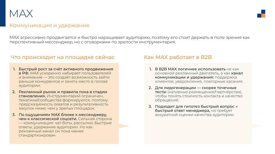 MAX растёт быстро, но рекламный рынок там ещё не устоялся: предсказуемость охватов и стоимость контакта пока нестабильны. Заходить стоит — чтобы занять место раньше конкурентов. Но как основной канал — рано.