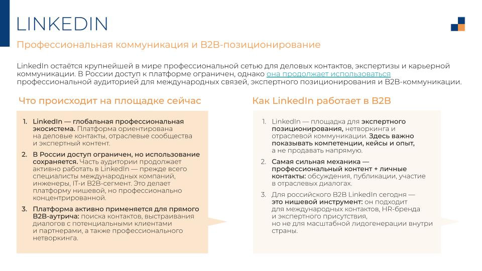 LinkedIn в России — нишевая история. Доступ ограничен, массовой аудитории нет. Но те, кто остался — IT-специалисты, менеджеры международных компаний, B2B-эксперты — используют платформу активно.