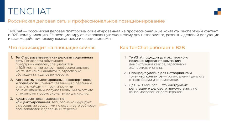 Для B2B — инструмент репутации, а не лидогенерации. Кейсы, разборы, отраслевые позиции. Если ваша аудитория — предприниматели и B2B-специалисты, присутствие имеет смысл. Если нужны объёмы — не сюда.