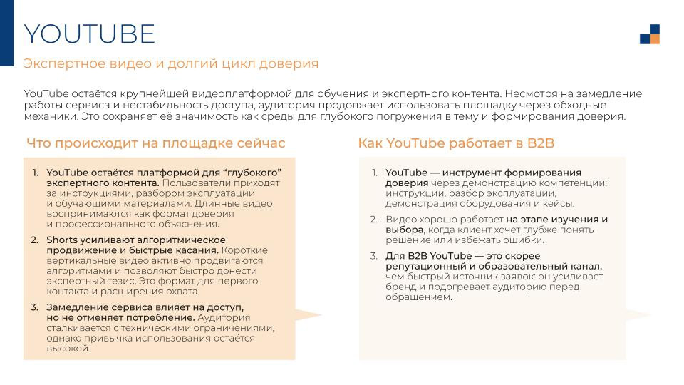 В B2B YouTube закрывает этап, который текст закрыть не может: покупатель промышленного оборудования хочет увидеть продукт в работе, услышать объяснение от человека. Это репутационный и образовательный канал. Быстрых заявок от него не ждите.