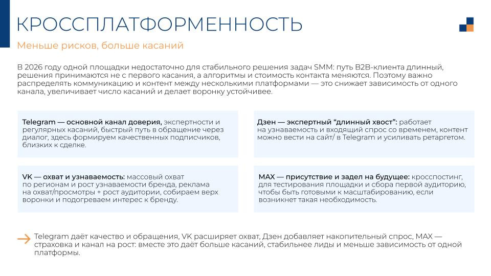 Кроссплатформенная стратегия — это про распределение ролей, а не про присутствие везде. Telegram закрывает доверие и доводит до обращения. ВКонтакте расширяет охват. Дзен накапливает входящий спрос. MAX — задел на рост.